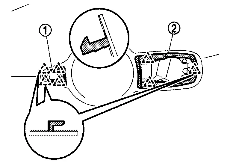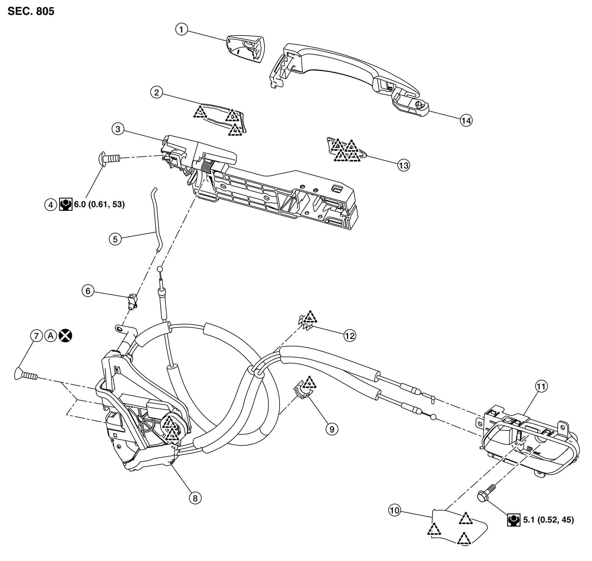 | 13. | Front gasket | 14. | Front door outside handle grip | A. | Comply with the installation procedure when tightening. Refer to Removal and Installation. |