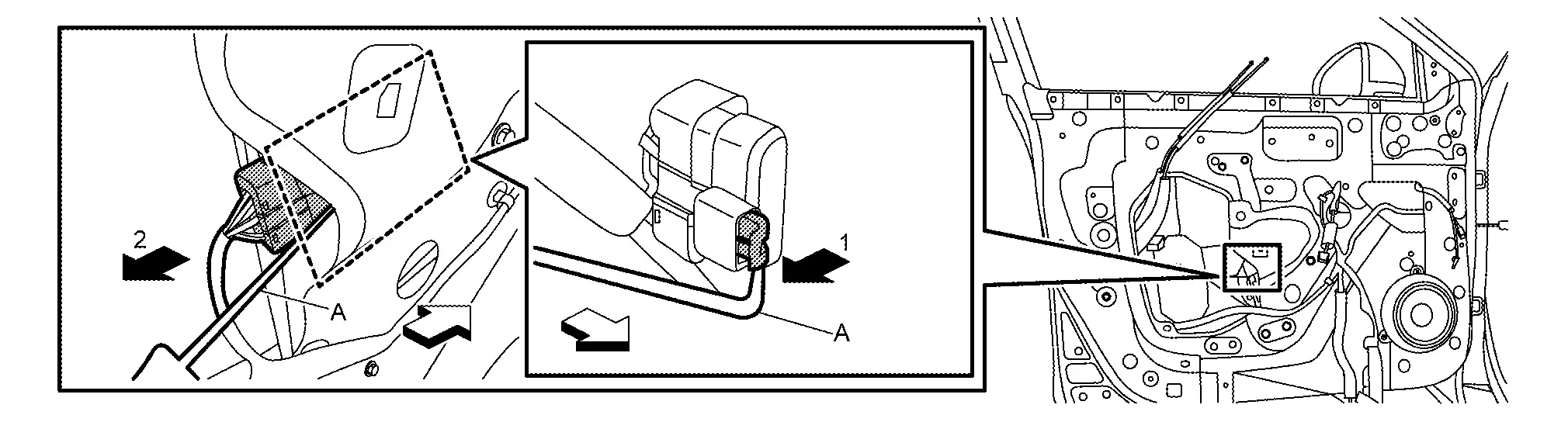 Disengage fixing portion using a remover tool (A) according to numerical order 1→2 as shown in figure, and then disconnect power window motor harness connector.