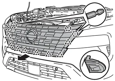 Disengage front grille fixing clips and pawls from back side while pulling front grille toward Nissan Ariya vehicle front.