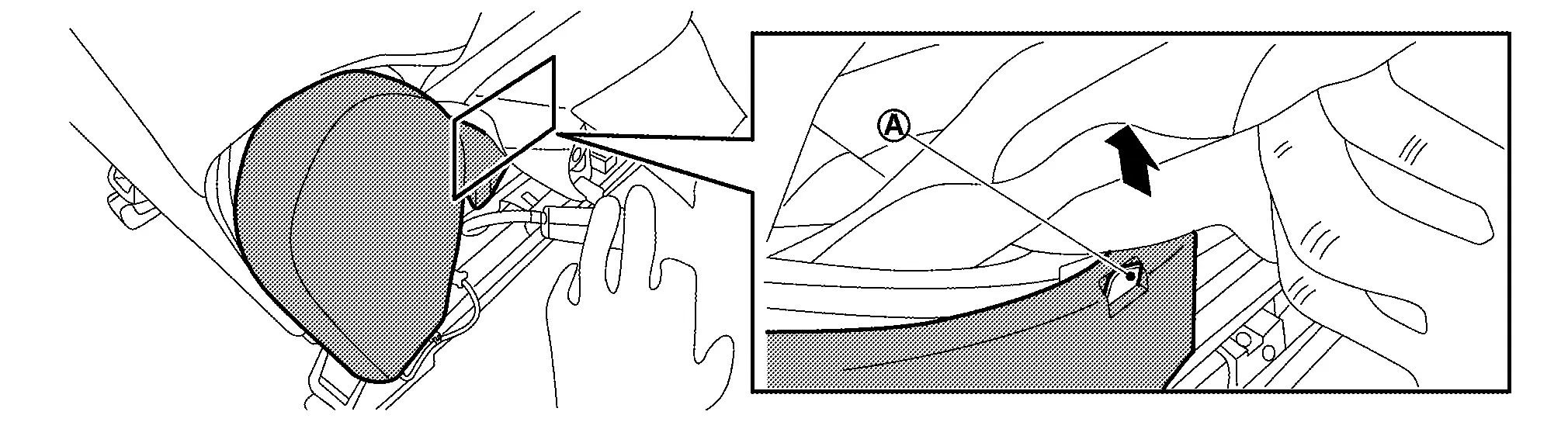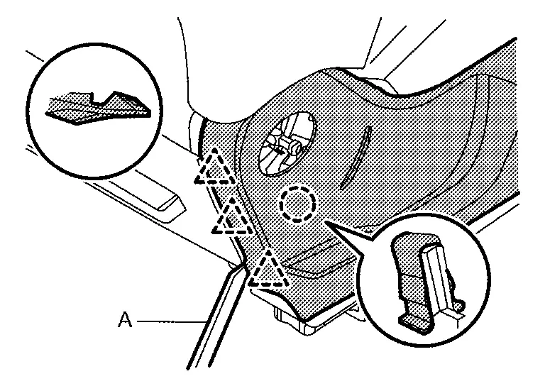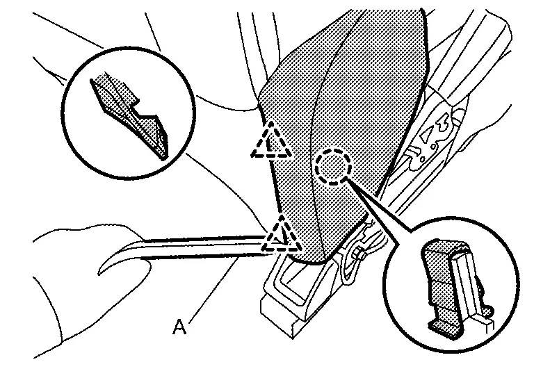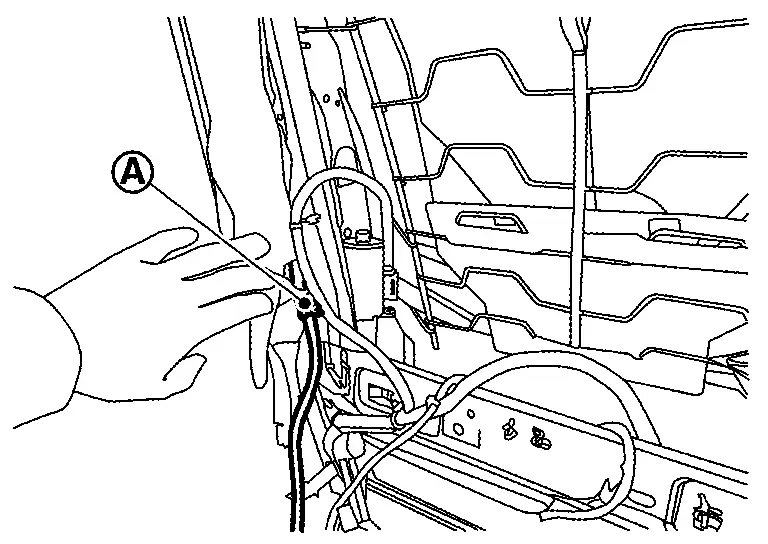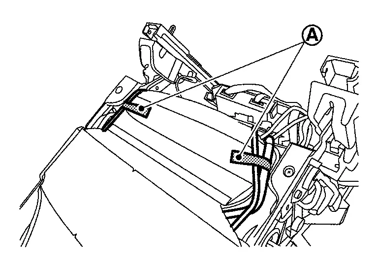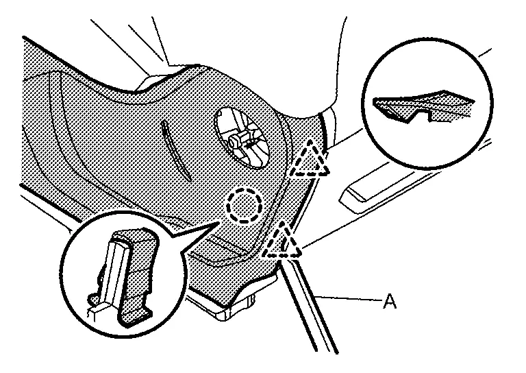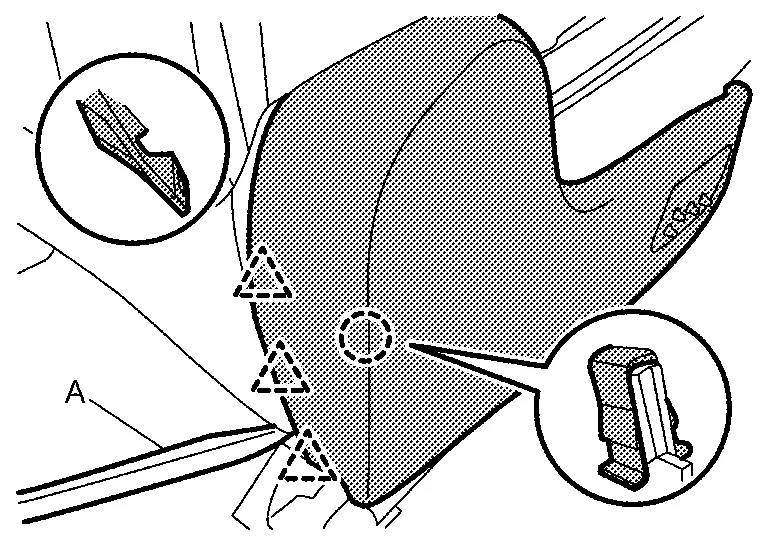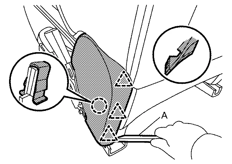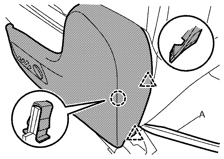 Disengage seat harness and harness connector fixing clips (A), and then remove inside seat cushion finisher lower.