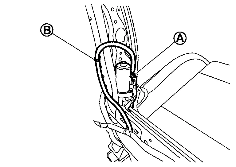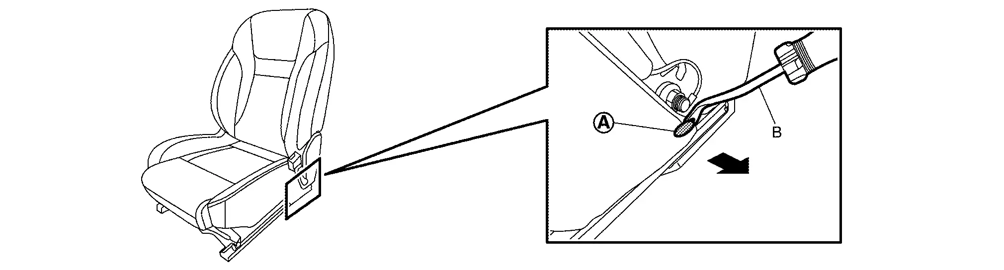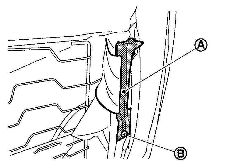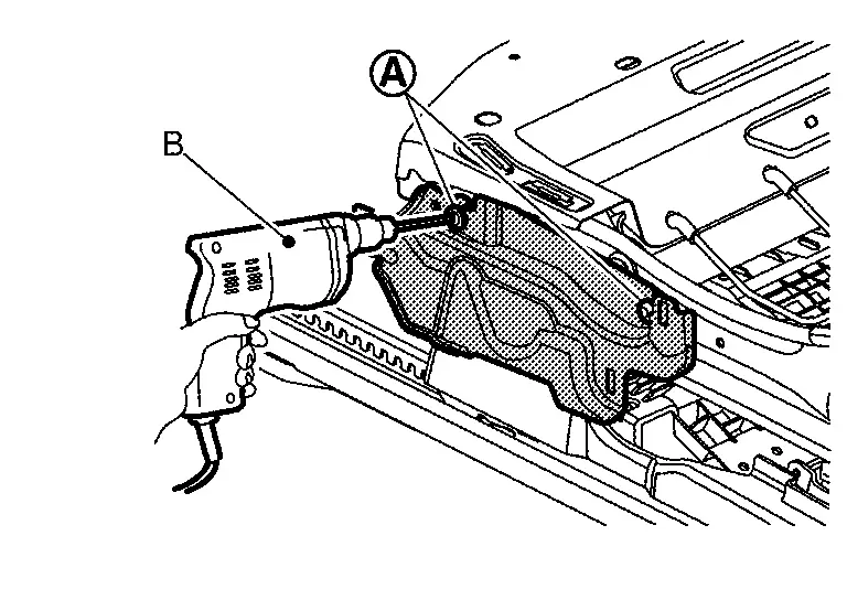 Remove mounting rivet (A) using a drill (B), and then remove outside seat cushion finisher bracket (driver seat).