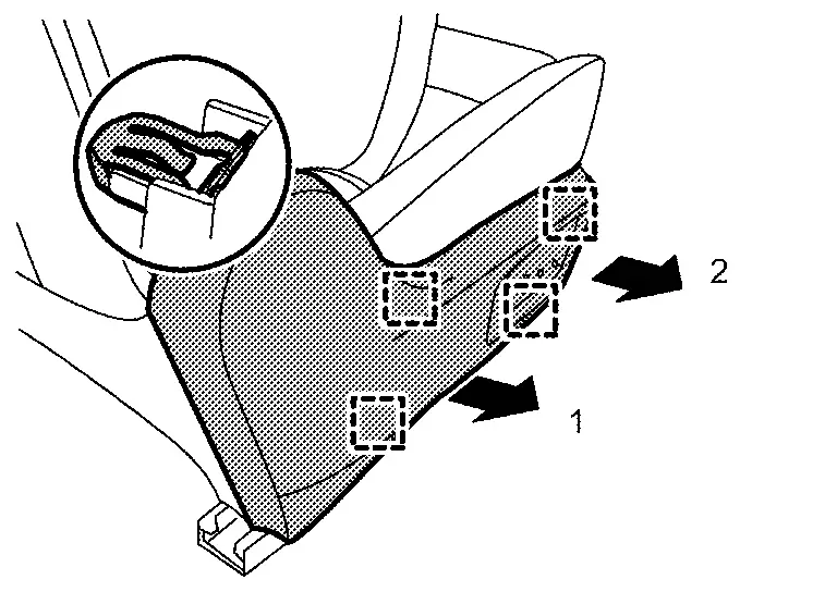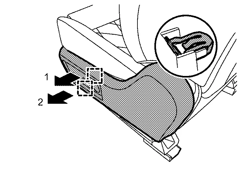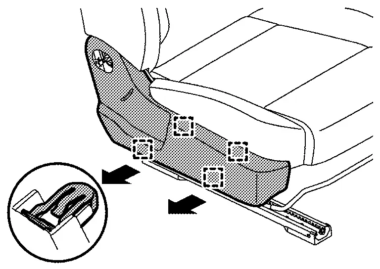Disengage seat cushion trim fixing clip (passenger seat) and retainer of inside seat cushion outer side. Refer to Disassembly and Assembly.