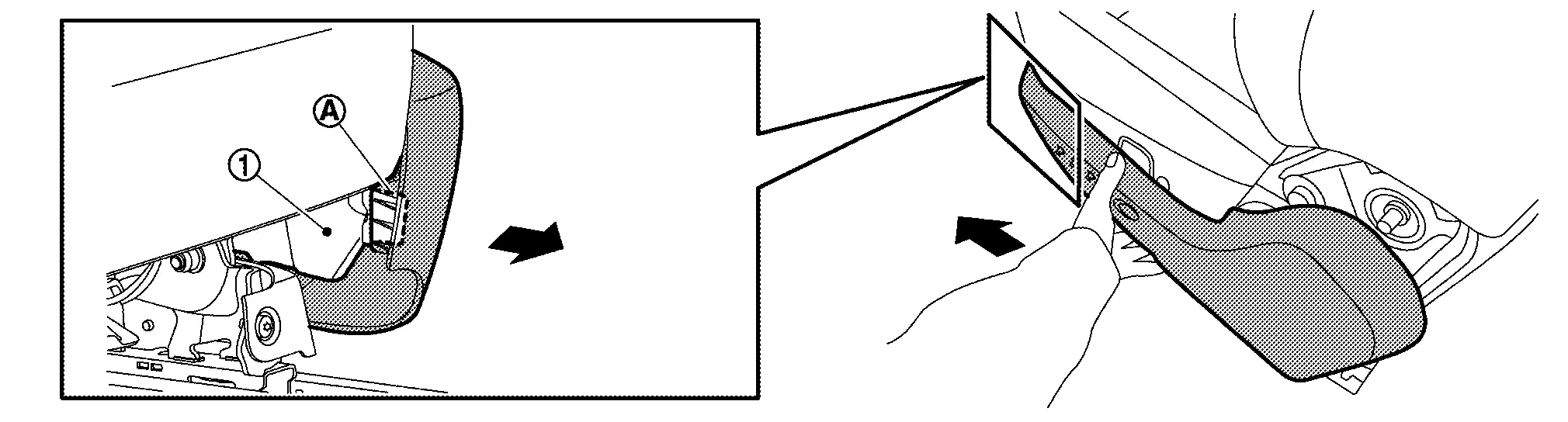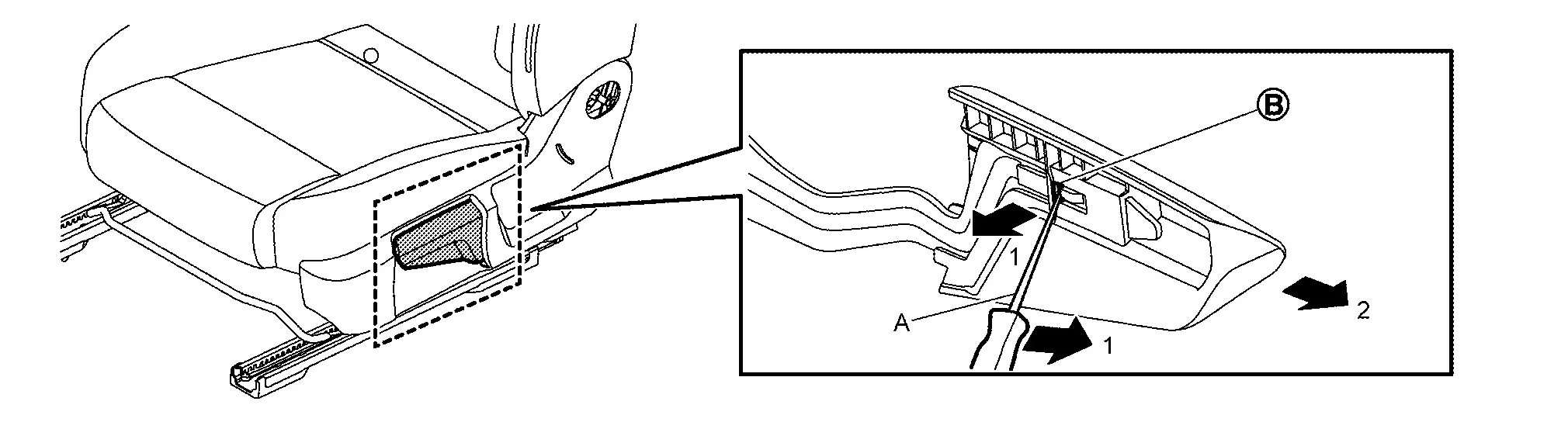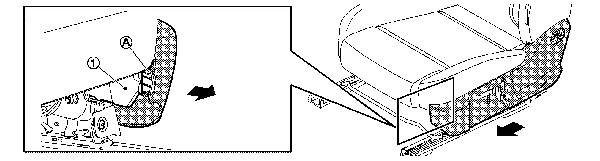 Disengage outside seat cushion finisher outer fixing guide (A) of seat cushion finisher bracket (1) direction arrow as shown in figure (driver seat).