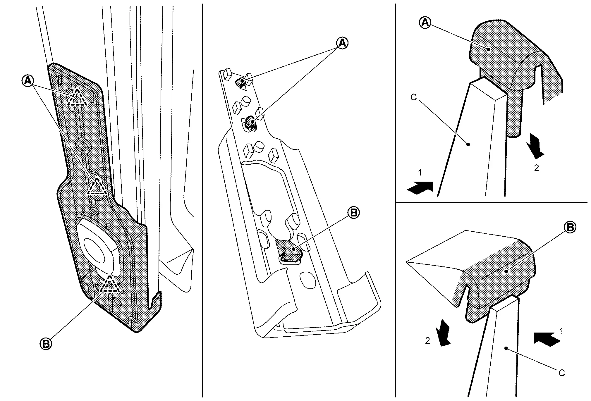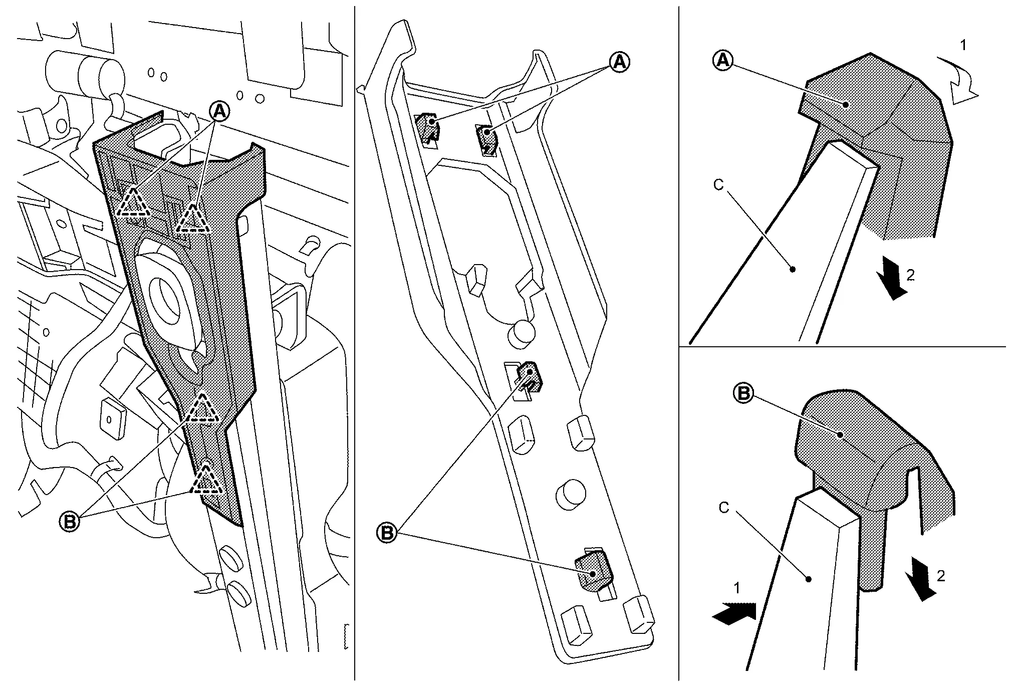 Disengage fixing pawls (A) and (B) using a remover tool (C) according to numerical order 1, 2 indicated by arrows as shown in figure, and then remove seat cushion lower end cap.