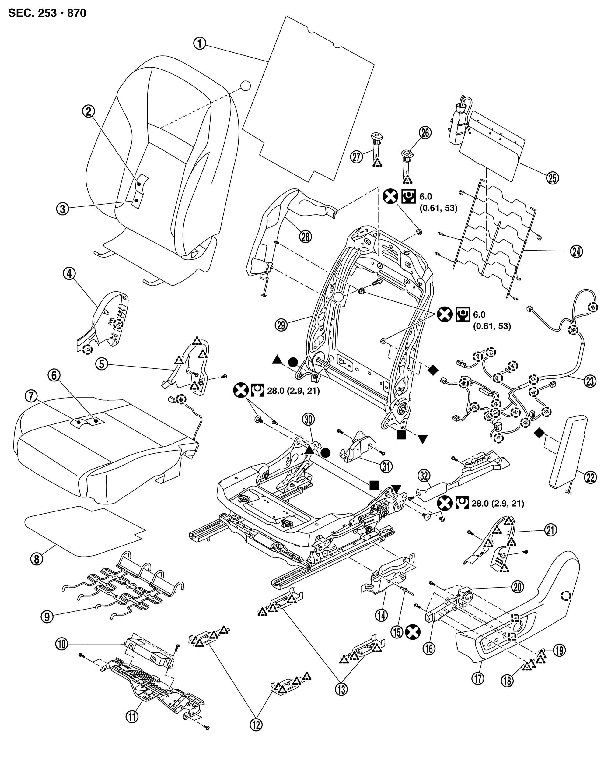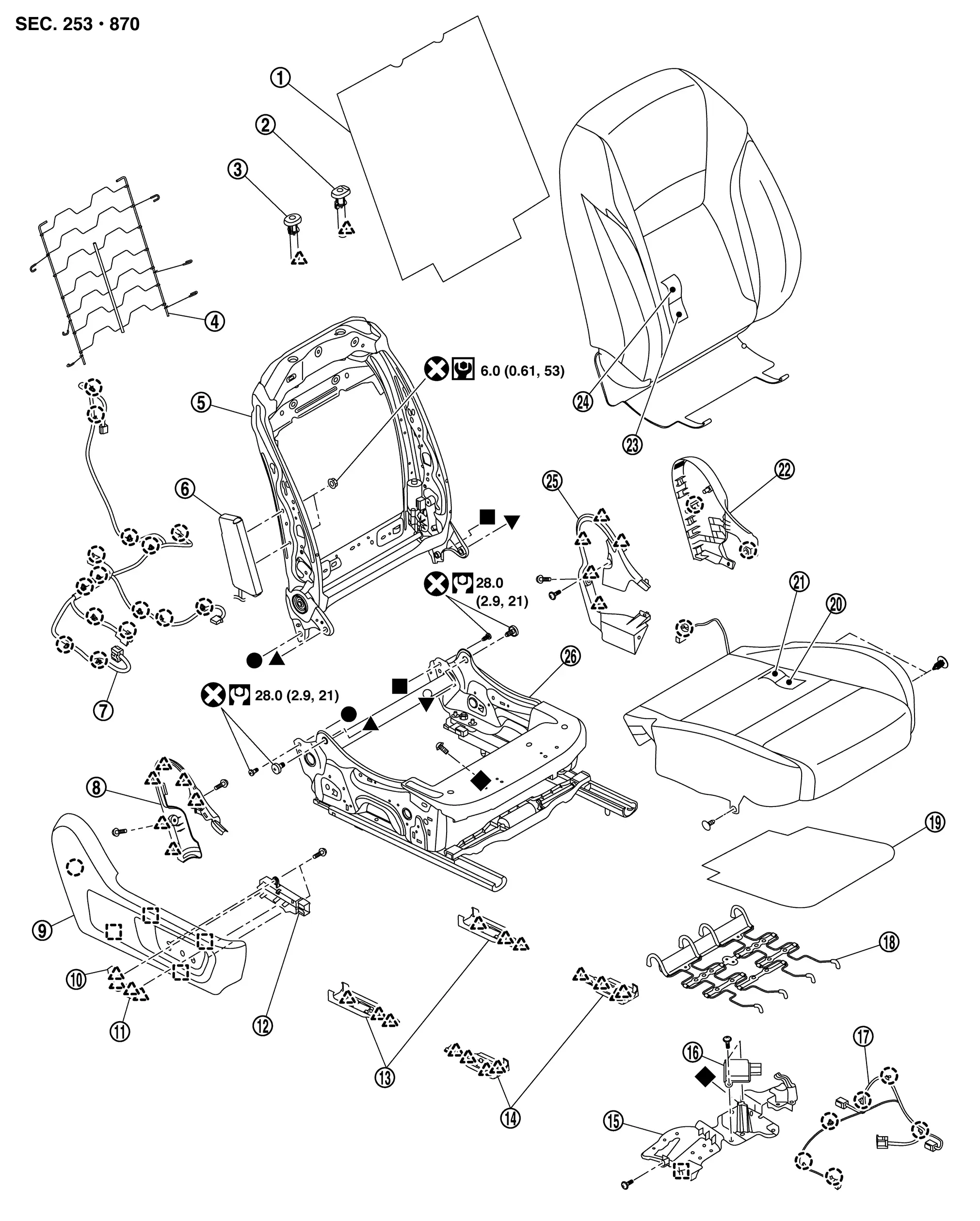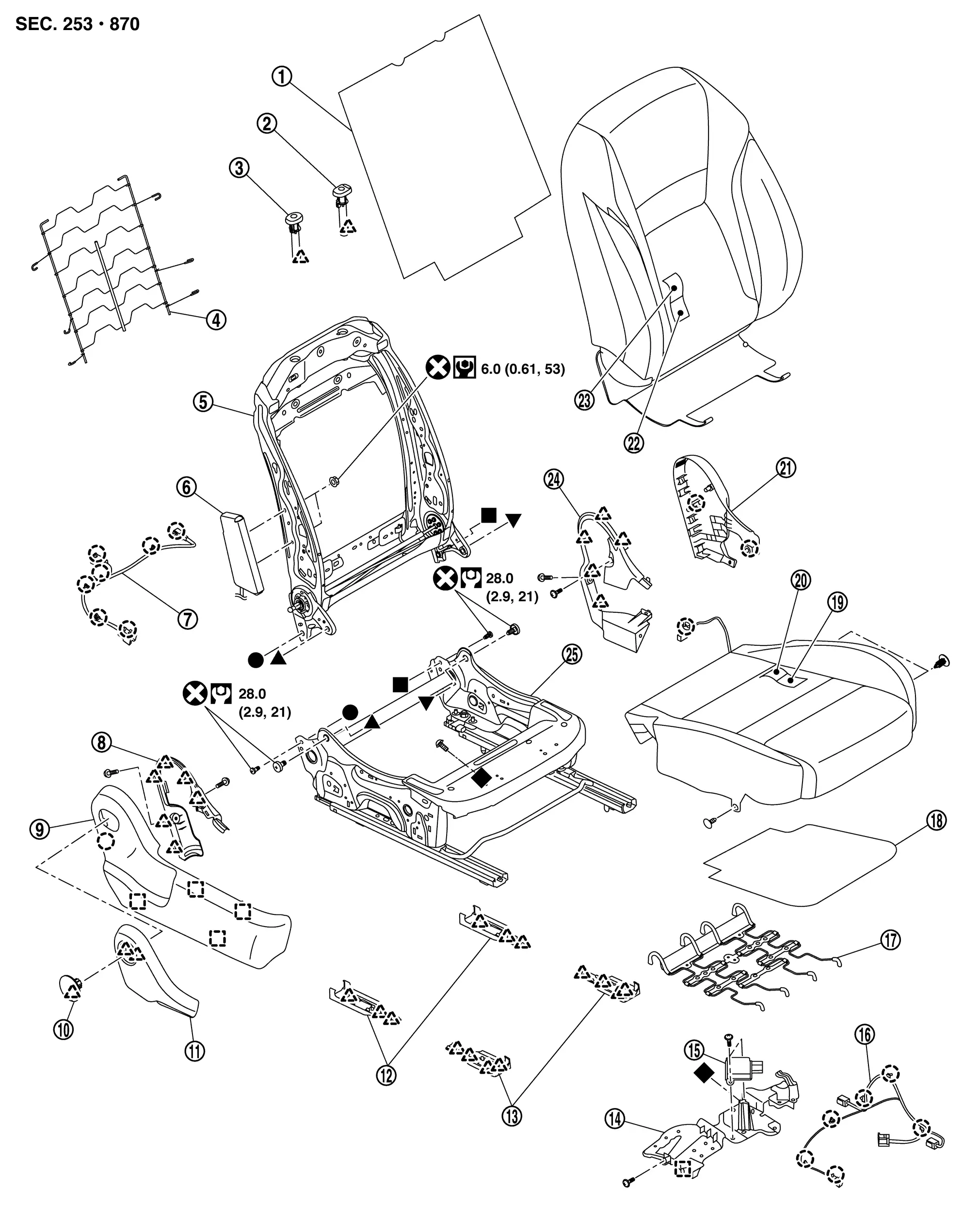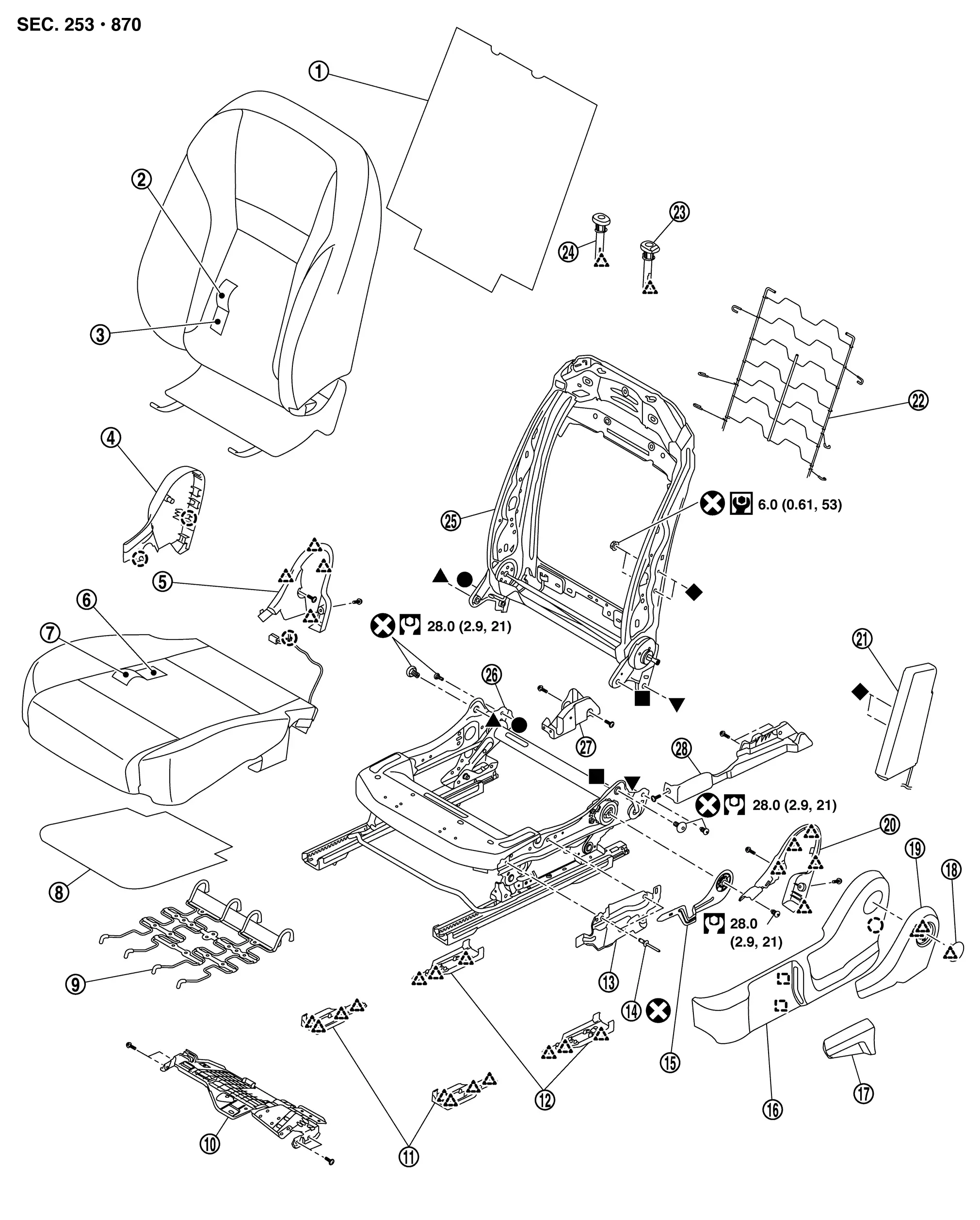 | 25. | Seatback frame | 26. | Seat cushion frame | 27. | Inside seat cushion finisher lower |