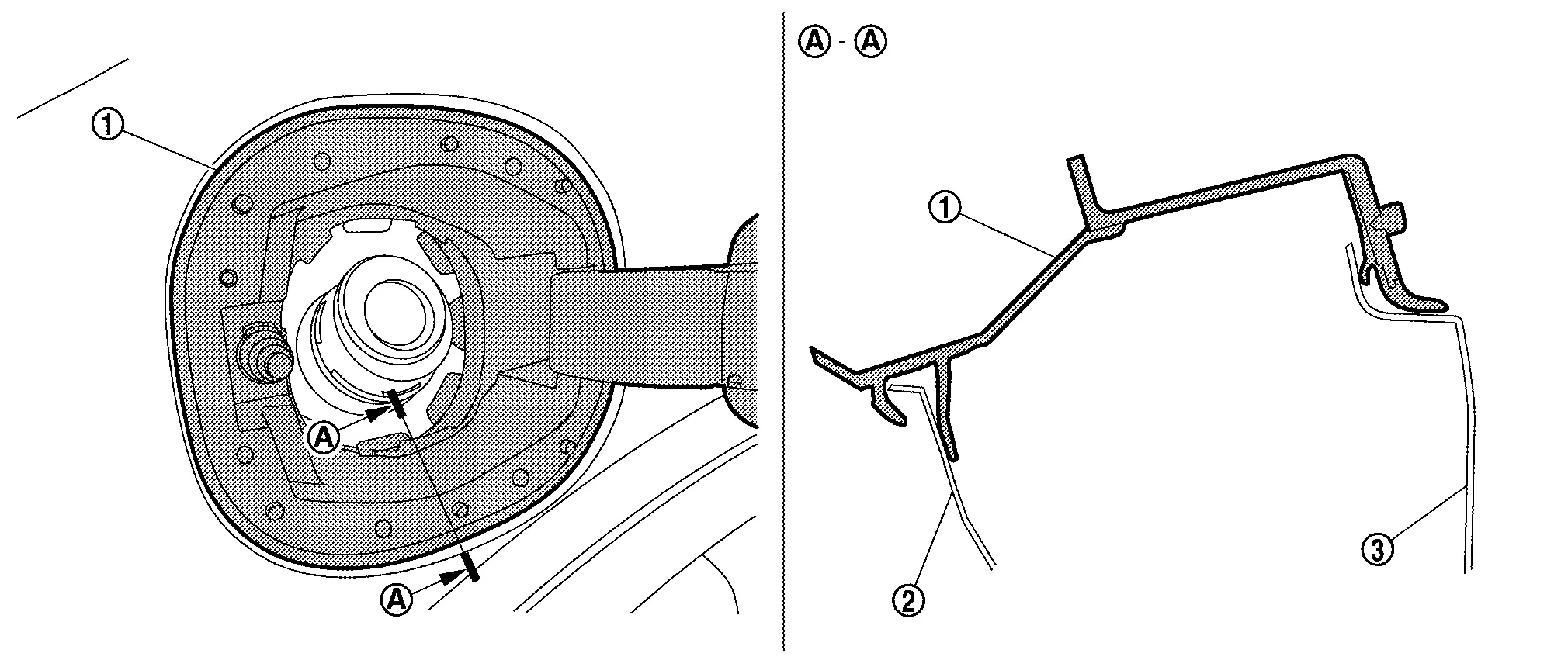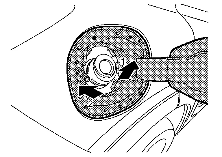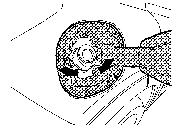 Install fuel filler base assembly to vehicle body according to the numerical order 1→2 indicated by arrows as shown in figure.