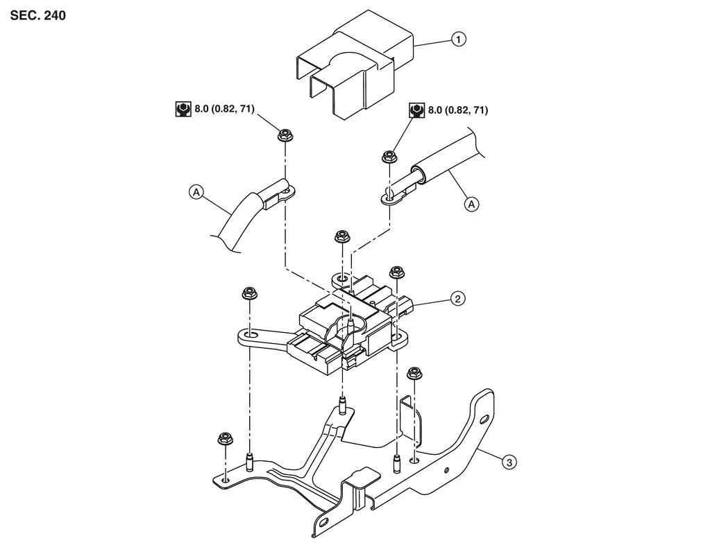 | 1. | Fusible link box cover | 2. | Fusible link box (12V sub battery) (lithium ion battery) | 3. | Fusible link box bracket |