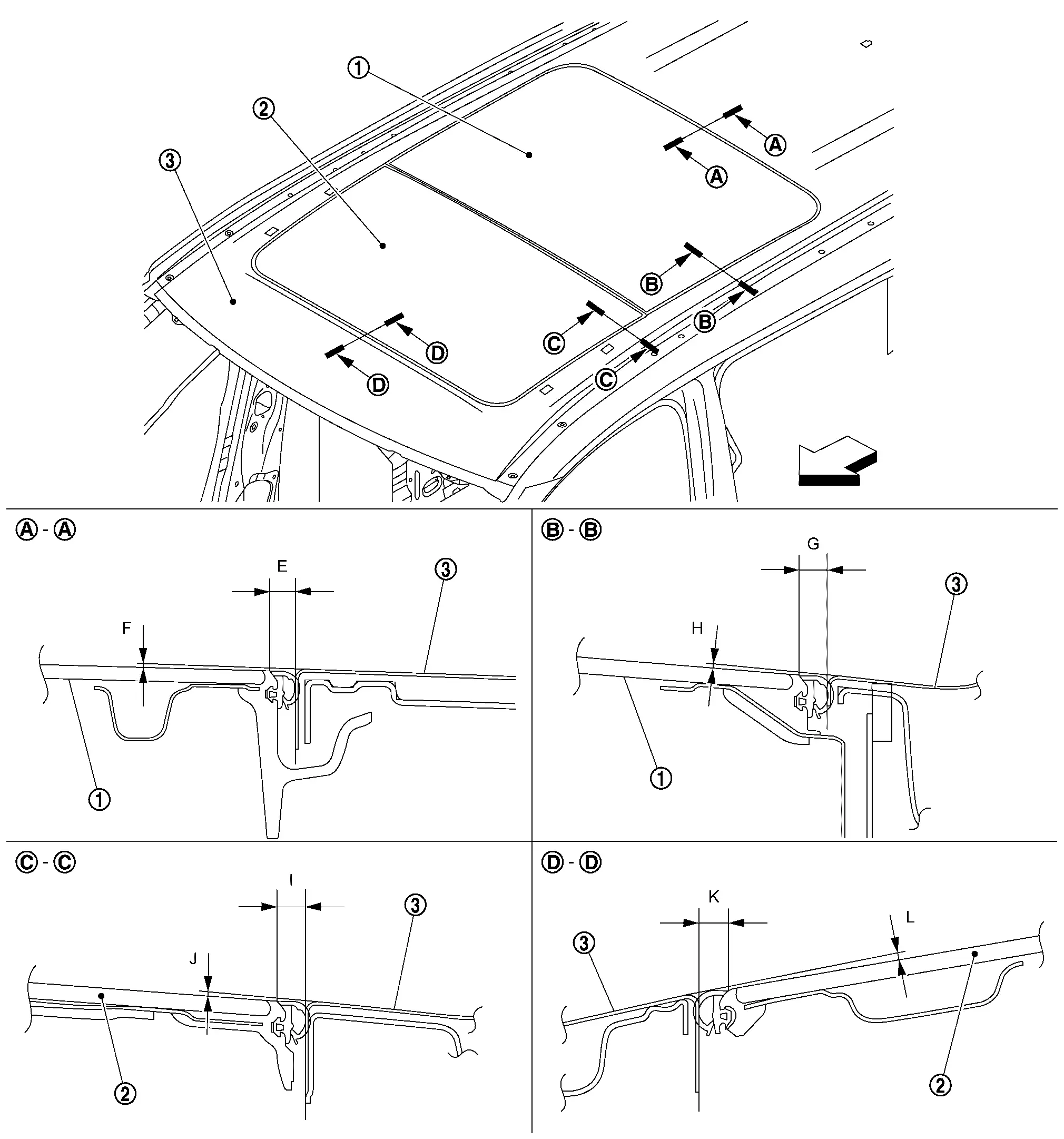 Standard of surface height is given assuming that the glass upper side status is (+), and the glass lower side status is (−) relative to the roof panel.