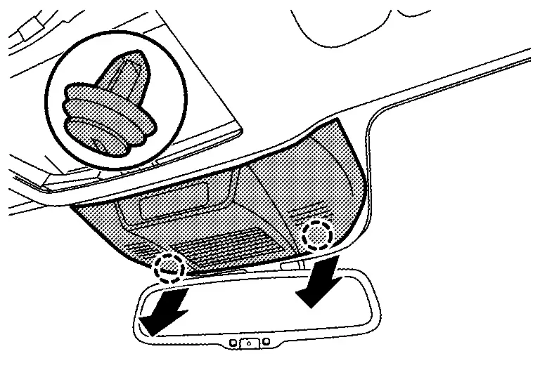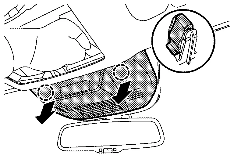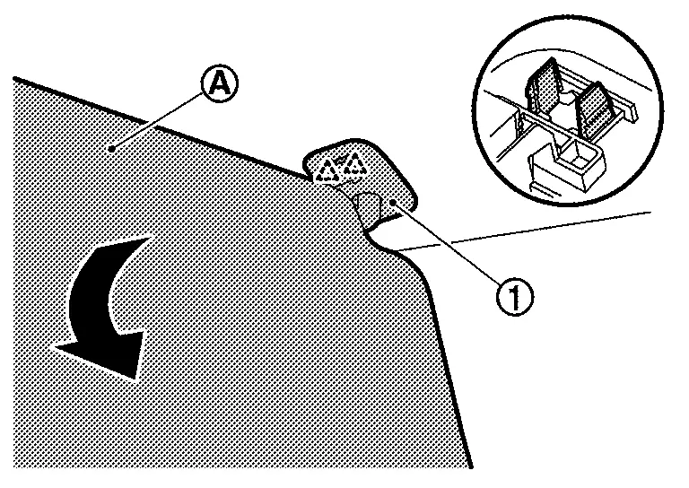 Rotate the sun visor body (A) to the direction of the arrow as shown in the figure, and then remove sun visor bracket (1) fixing pawls.