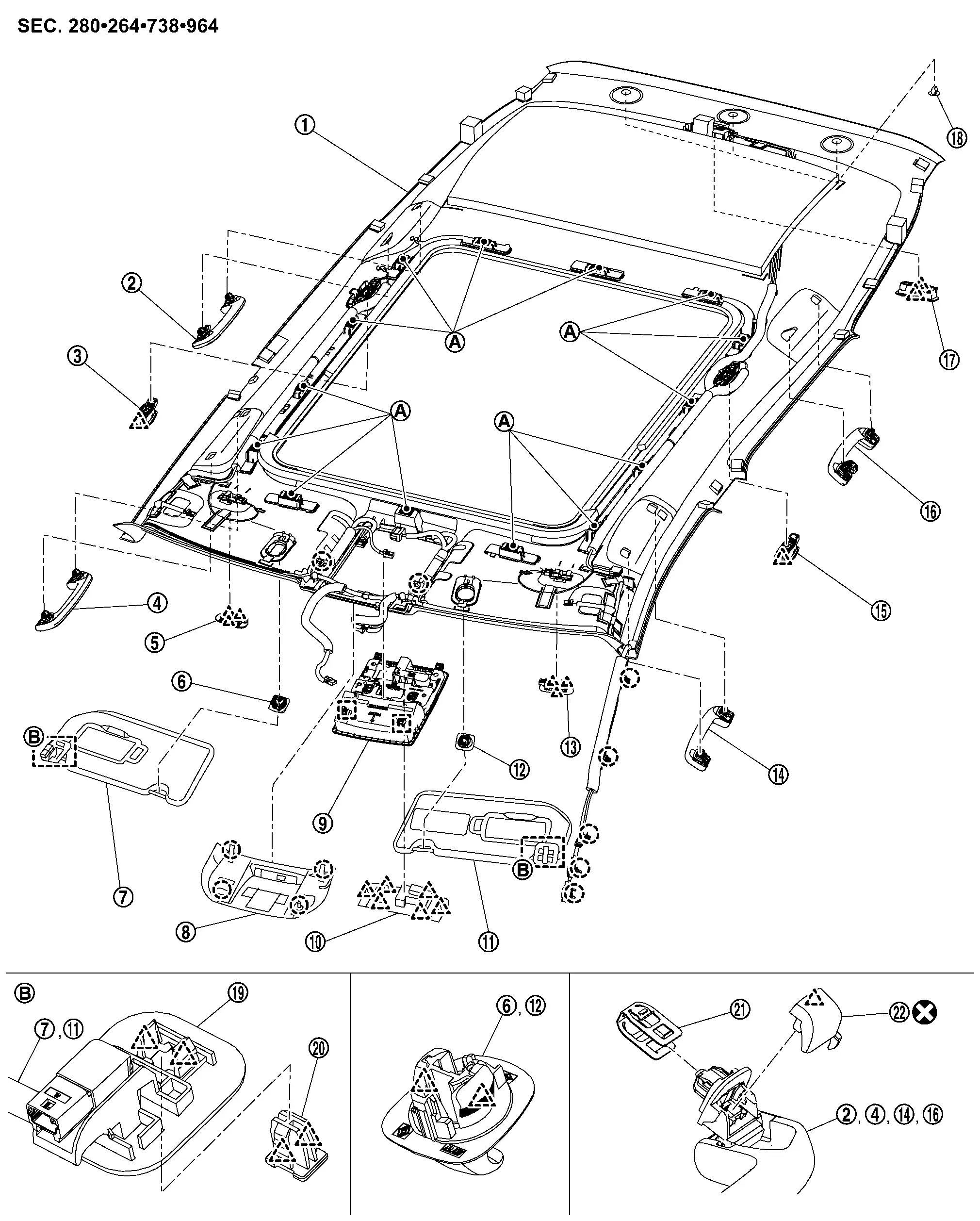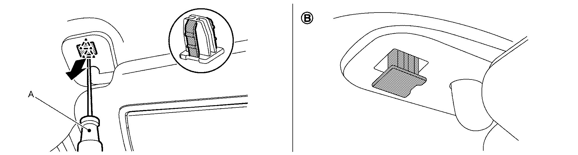 Remove sun visor assembly (LH and RH).Disengage bracket locker fixing pawls using a remover tool (A).