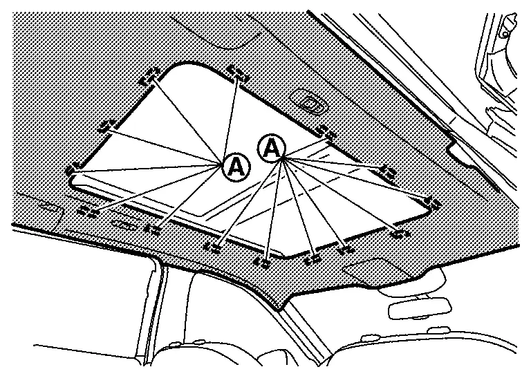 Detach dual lock fasteners (A) between headlining assembly and roof panel.