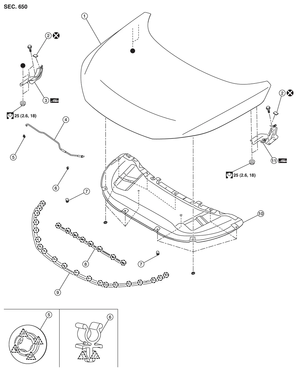 | 4. | Front fender assembly | 5. | Hood hinge | 6. | Hood bumper rubber |