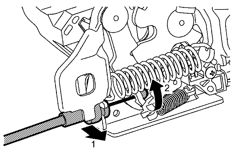 Disconnect hood lock release cable from hood lock according to the numerical order 1→2 indicated by arrows as shown in figure.