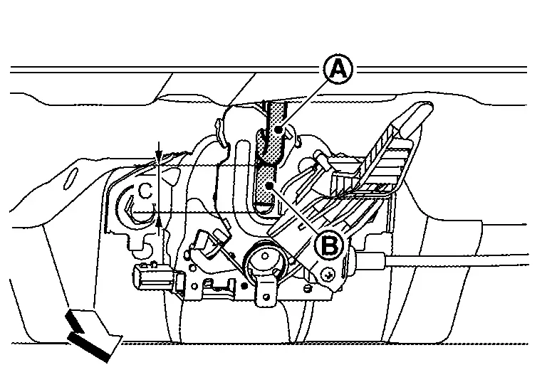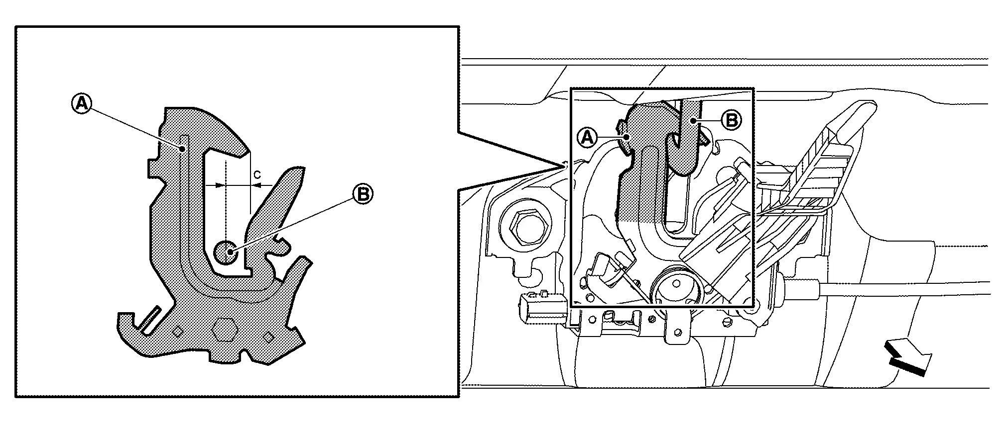 While operating the hood opener carefully, check that the front end of the hood is lifted by approximately 20 mm (0.787 in) (C). Also, check that the hood opener returns to the original position.