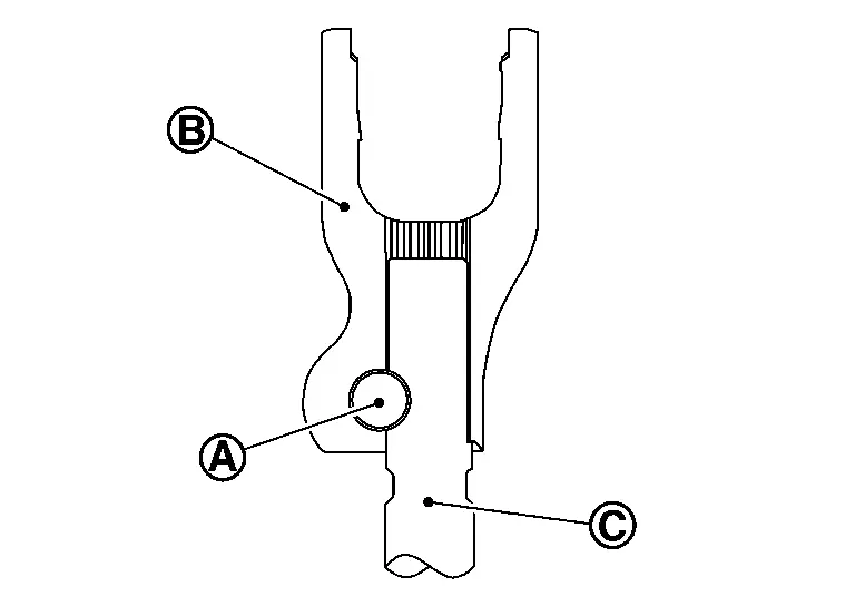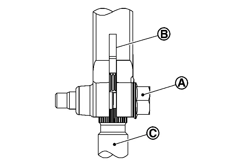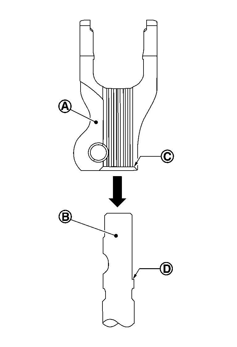 After aligning the blocking phase of pinion, the yoke (A) shall be inserted to the pinion shaft (B) until yoke lower surface (C) is in contact with pinion shaft surface (D).