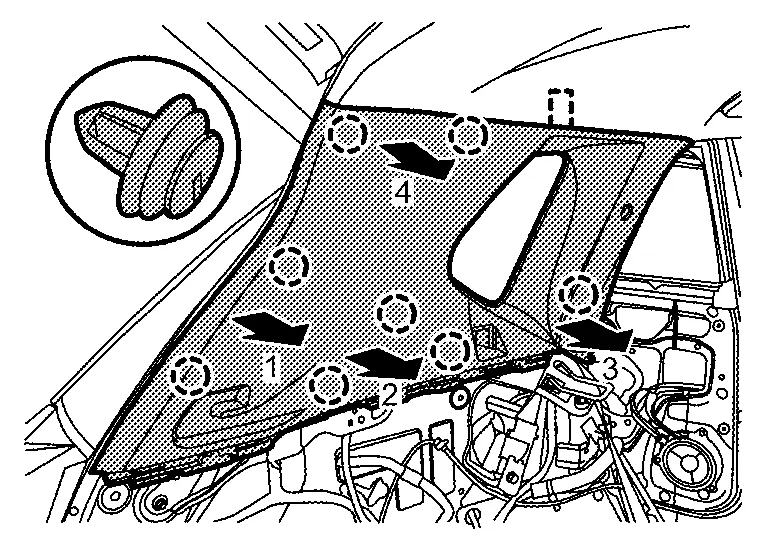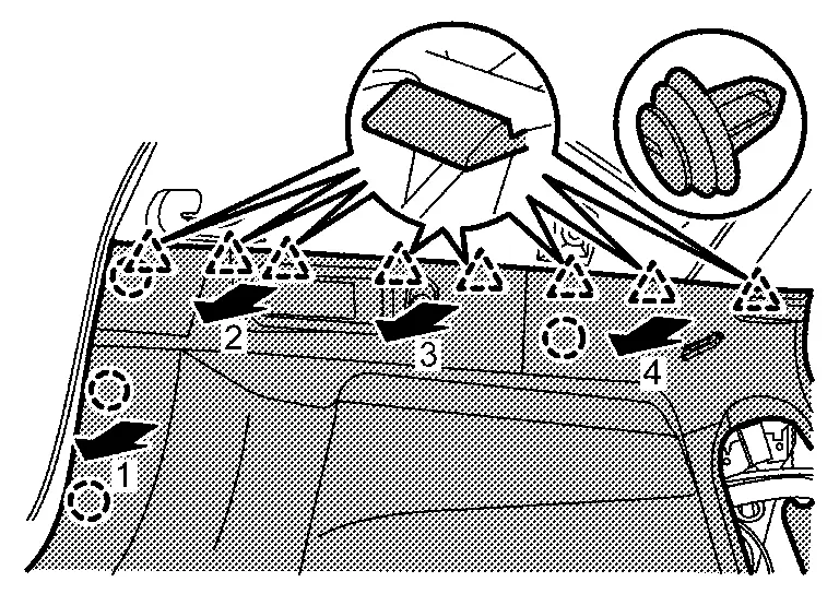 Disengage luggage side upper finisher fixing clips according to numerical order 1→4 indicated by arrows as shown in the figure.