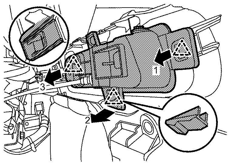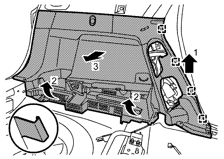 Disengage luggage side lower finisher fixing metal clips according to numerical order 1→3 indicated by arrows as shown in the figure.