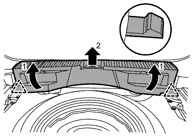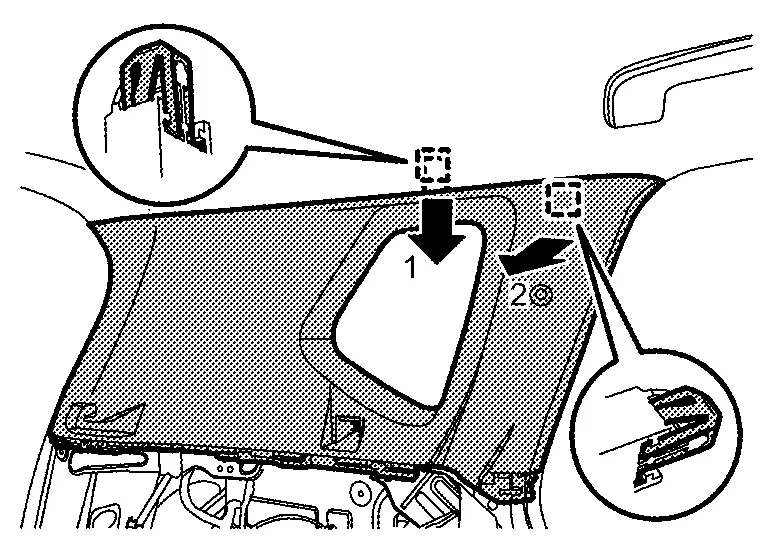 Disengage fixing metal clips according to numerical order 1→2 indicated by arrows as shown in the figure, and then remove luggage side upper finisher.