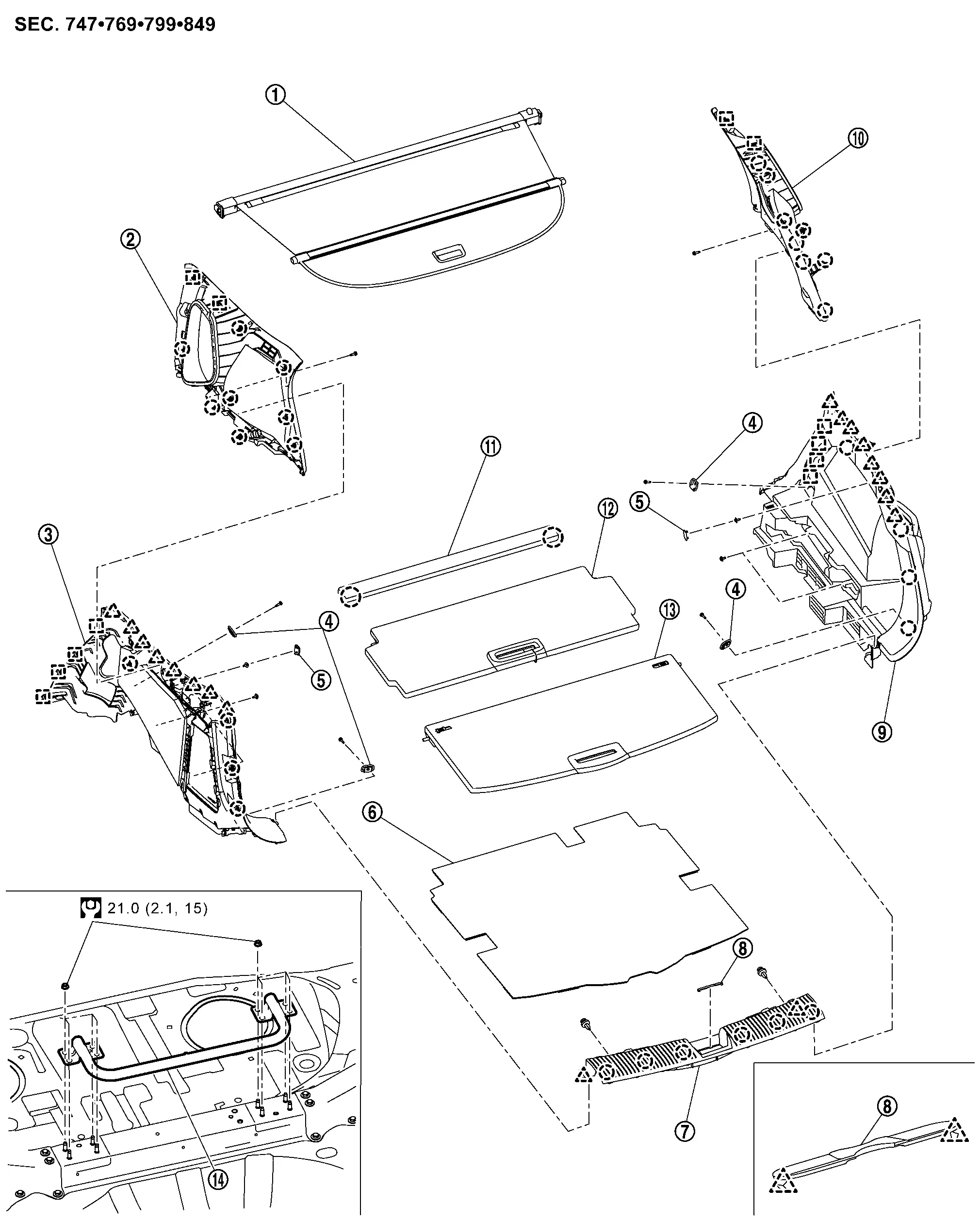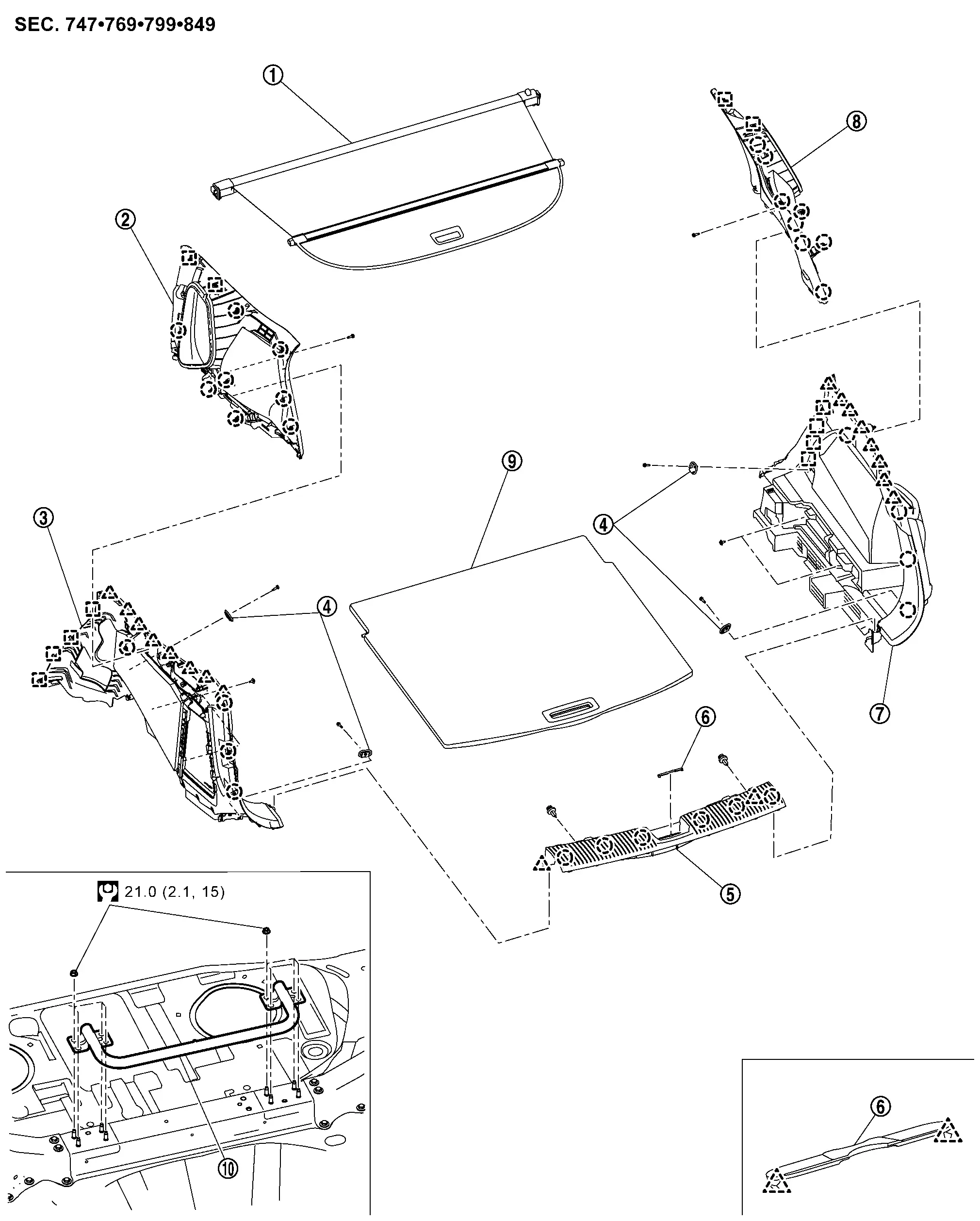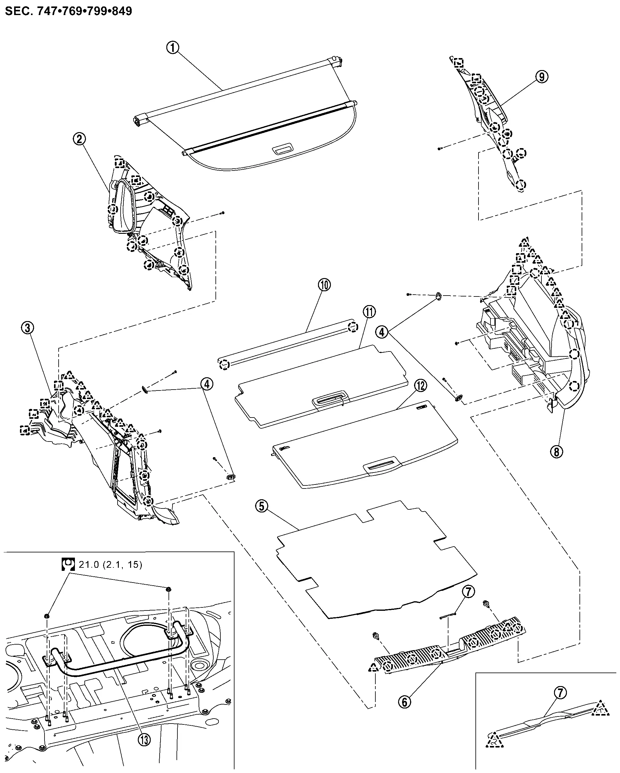 | 7. | Luggage rear plate mask | 8. | Luggage side lower finisher RH | 9. | Luggage side upper finisher RH |