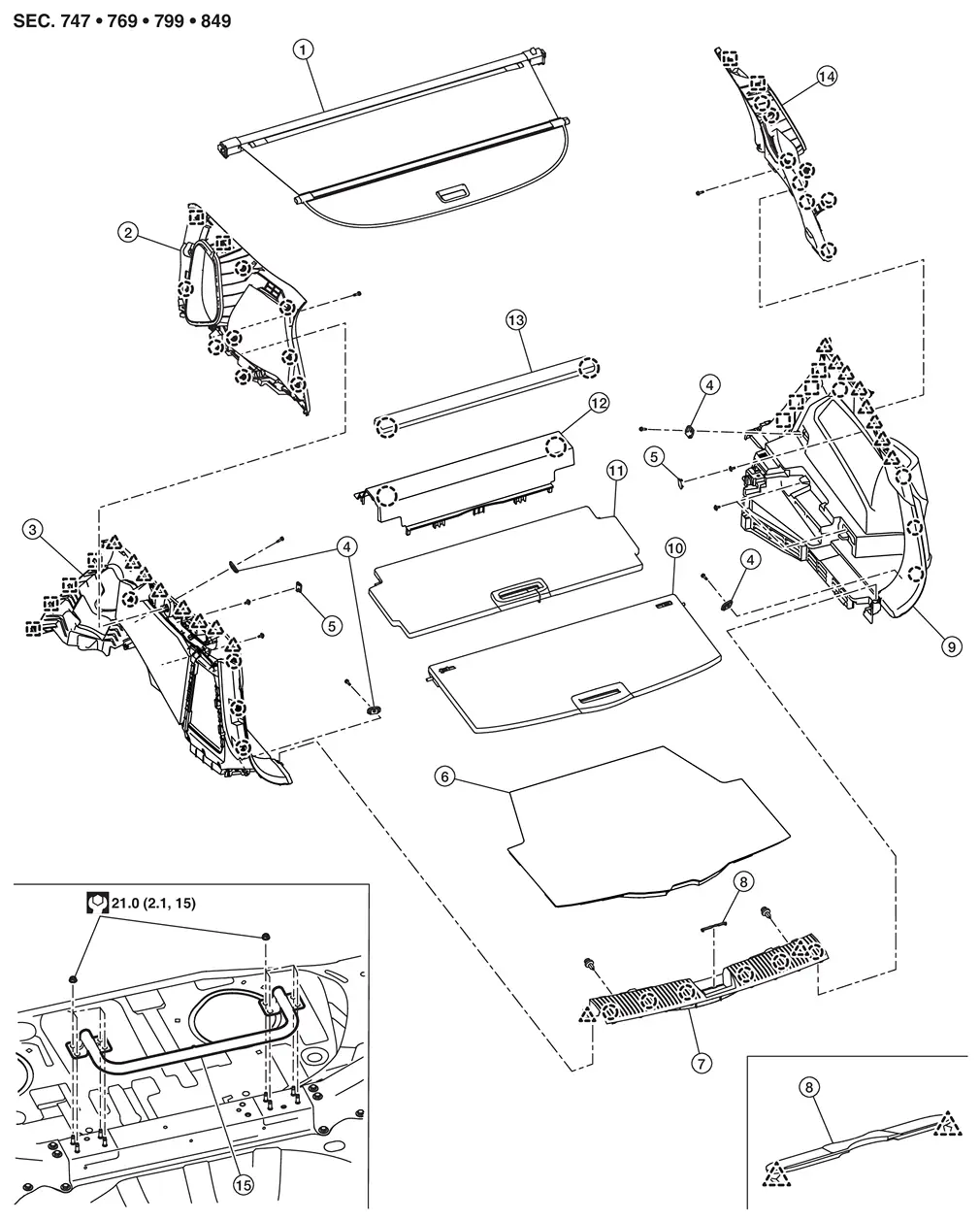 | 13. | Front luggage floor board | 14. | Luggage side upper finisher RH | 15. | Rear cross bar assembly |