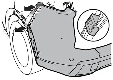 Pull rear bumper fascia side toward the Nissan Ariya vehicle side to disengage the fitting of rear bumper side bracket and rear bumper fascia side according to the numerical order 1→2 as shown by the arrows in the figure.