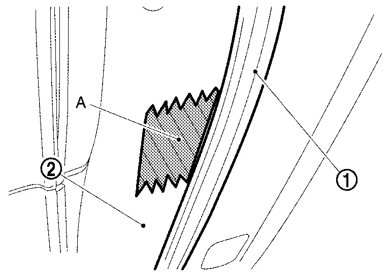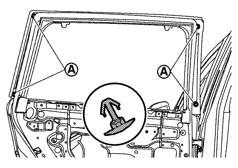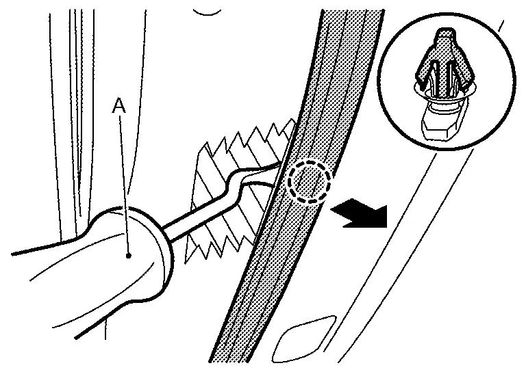 Disengage fixing clips on the reverse side of rear door weather-strip using a remover tool (A).