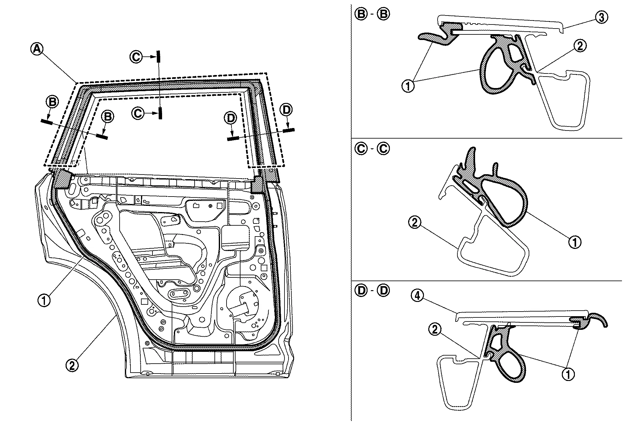 When reuse rear door weather-strip, always replace double-sided tape with new one.