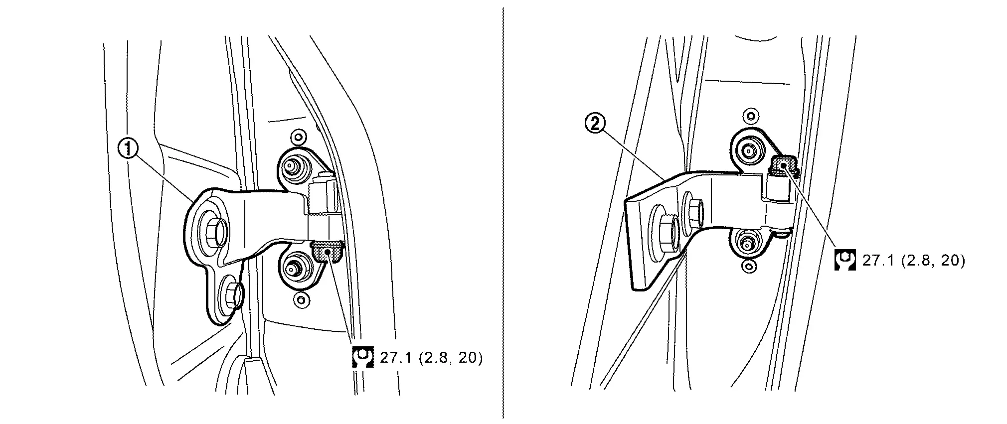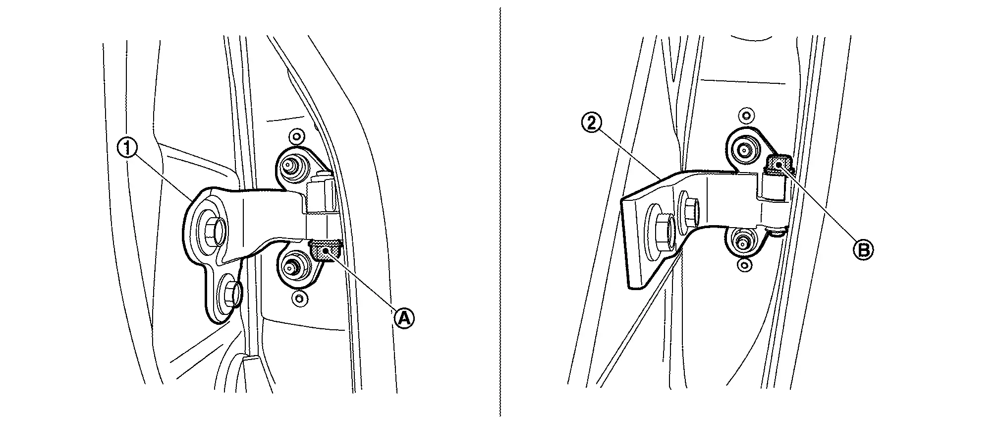 After installation, apply touch-up paint (the body color) onto the head of rear door hinge mounting bolts and nuts.