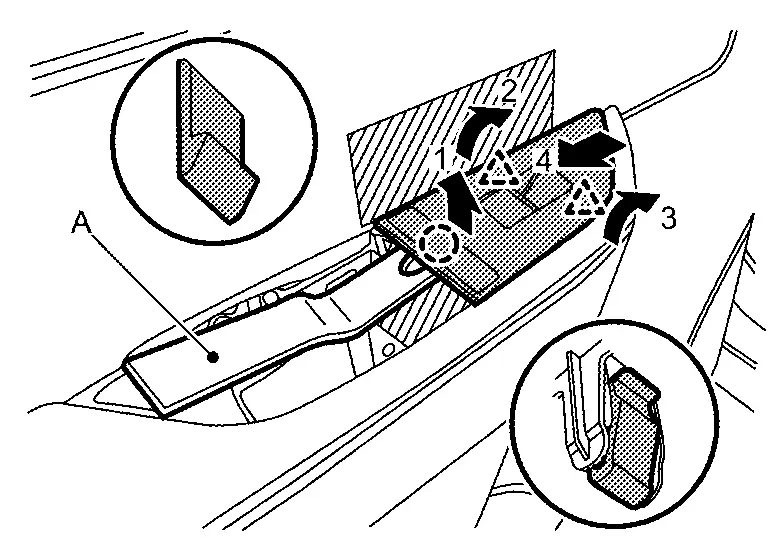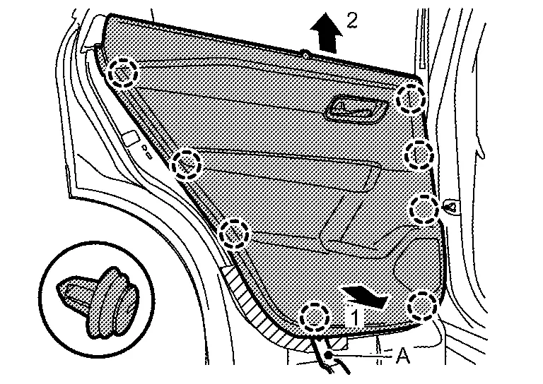 Disengage rear door finisher fixing clips using a remover tool (A) according to numerical order 1→2 indicated by arrows as shown in the figure.
