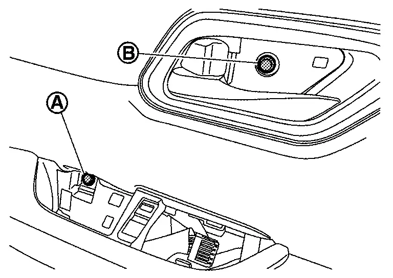 Remove rear door finisher mounting screw (A) and mounting bolt (B).