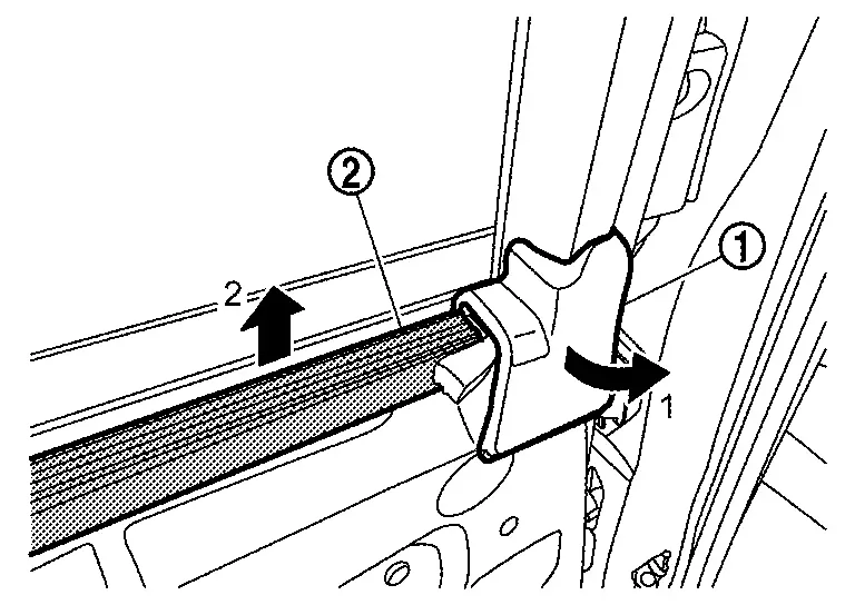 Disengage rear door weather-strip (1), and then remove inside seal (2), according to numerical order 1→2 indicated by arrows as shown in the figure,.