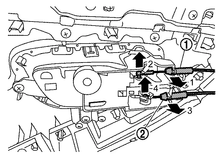 Disconnect lock knob cable (1) and inside handle cable (2) from inside handle according to numerical order 1→4 indicated by arrows as shown in the figure, and then remove rear door finisher.