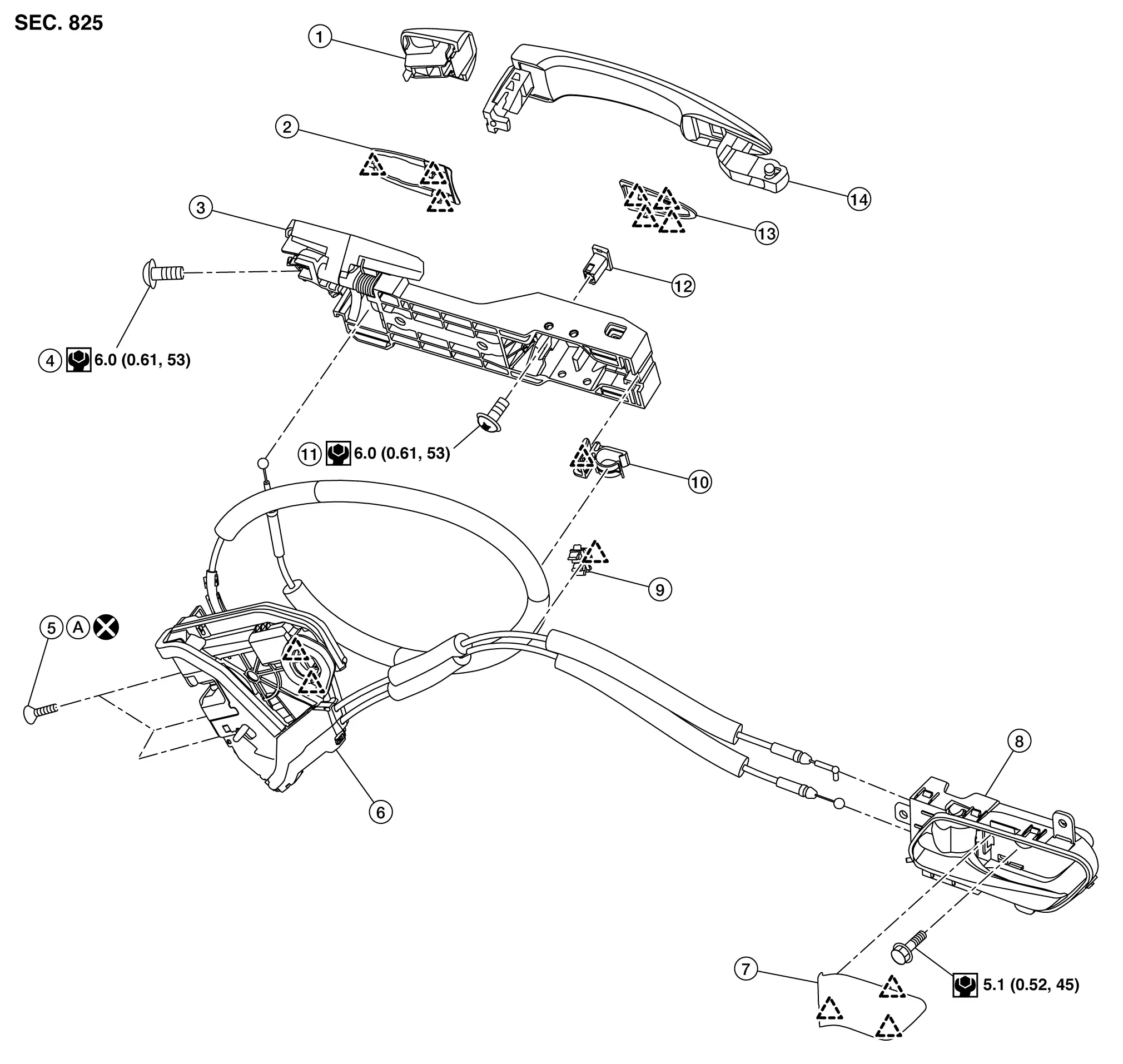 | 13. | Front gasket | 14. | Rear door outside handle grip | A. | Comply with the installation procedure when tightening. Refer to Removal and Installation. |