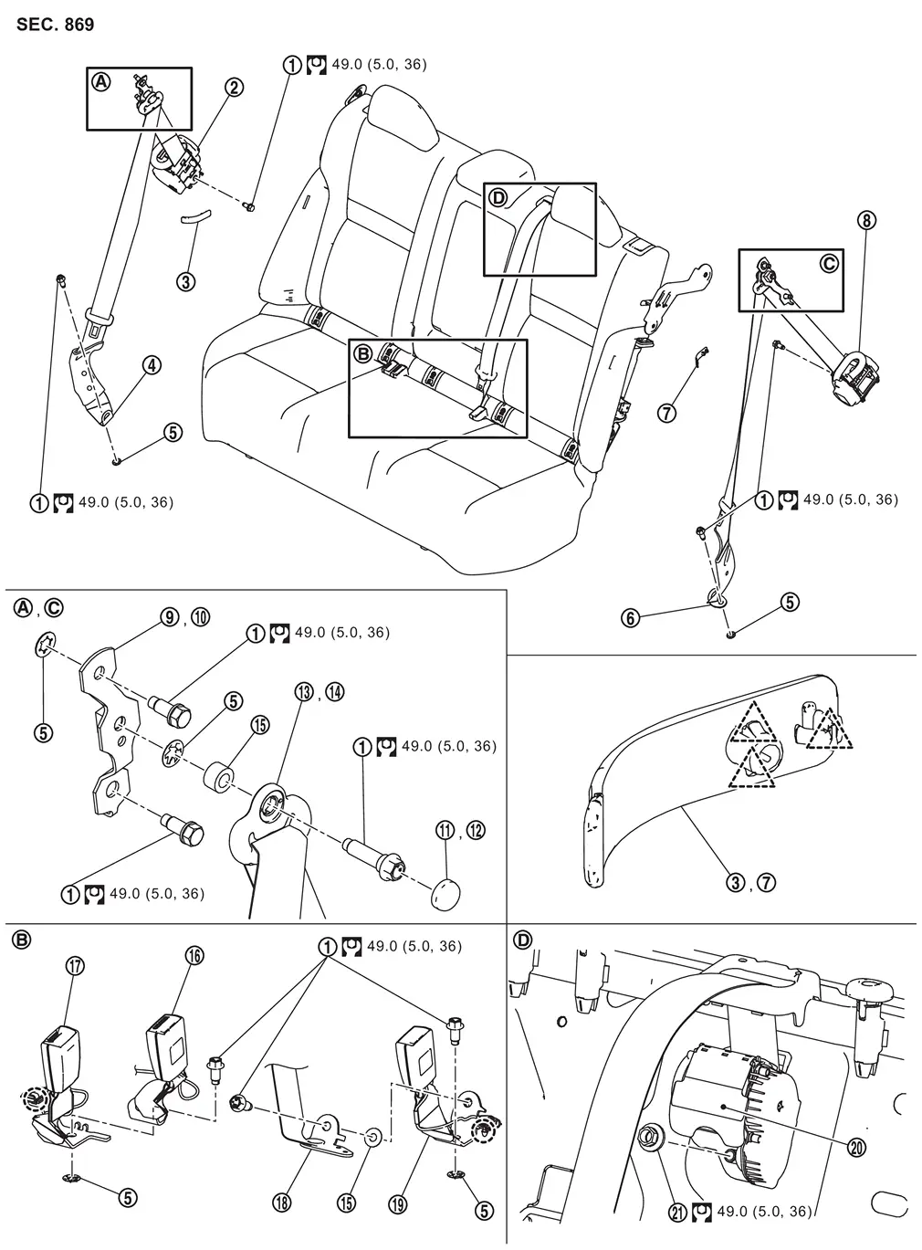 | 19. | Seat belt buckle LH | 20. | Center seat belt retractor | 21. | Anchor nut |