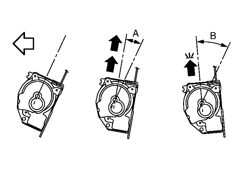 Slowly pull out webbing while tilting the retractor assembly forward from the mounted position without twisting the retractor assembly as shown in the figure.