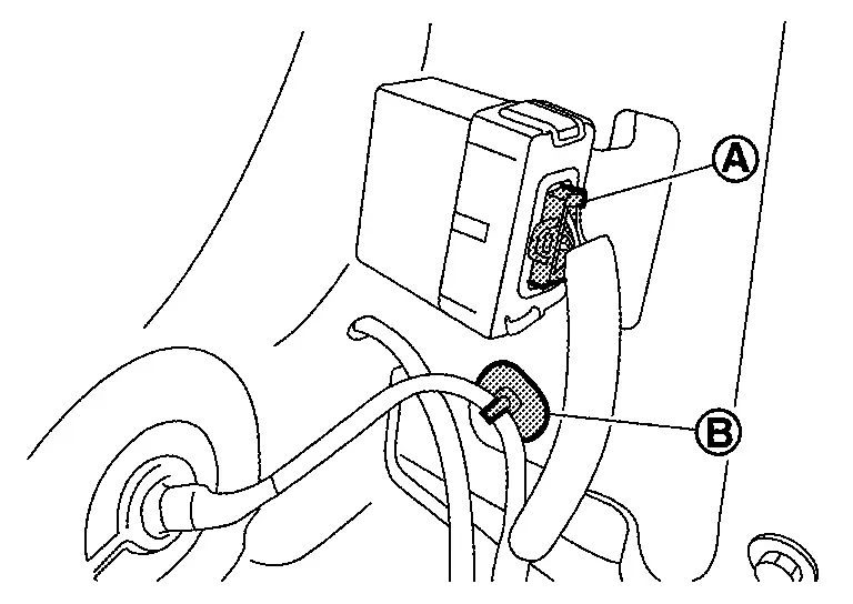 Disconnect harness connector (A) and remove harness clip (B).