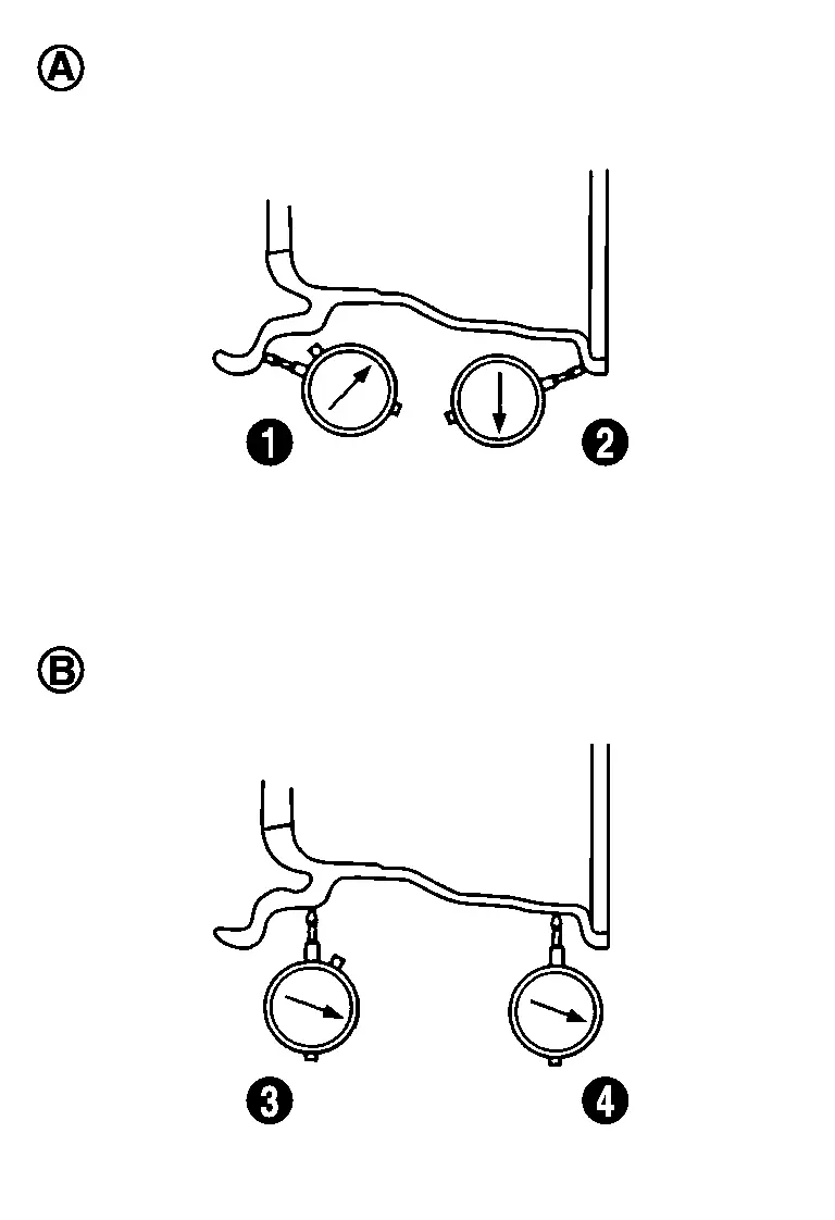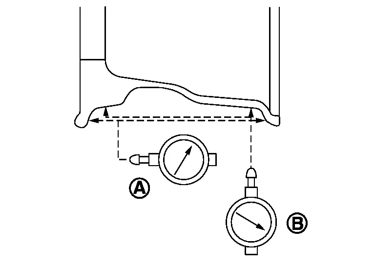 Check wheels for deformation, cracks and other damage. If deformed, remove wheel and check wheel runout.Remove tire from steel wheel and mount wheel on a tire balance machine. Set two dial indicators as shown in the illustration.