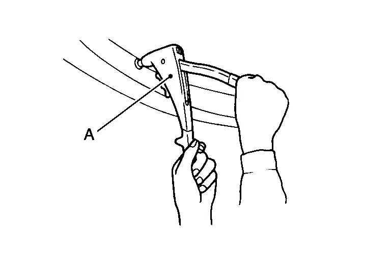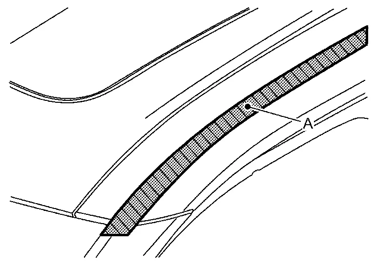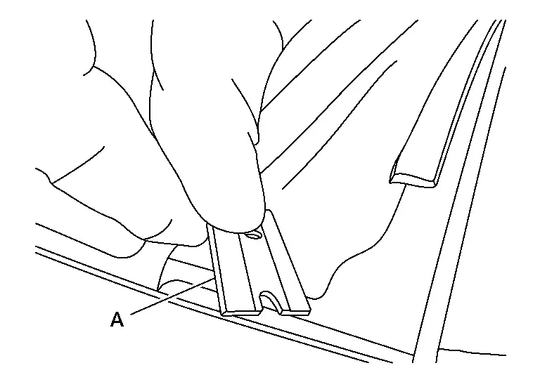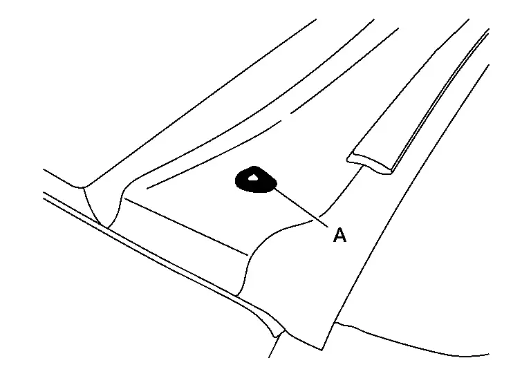Using suitable tool (A), remove any sealer and any remaining pieces of the roof rail clip that are present from the leading roof rail clip hole.