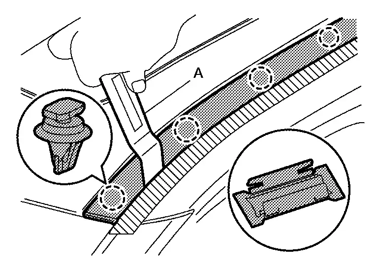 Replace roof rail clip, and remove seal (A) from roof rail clip.