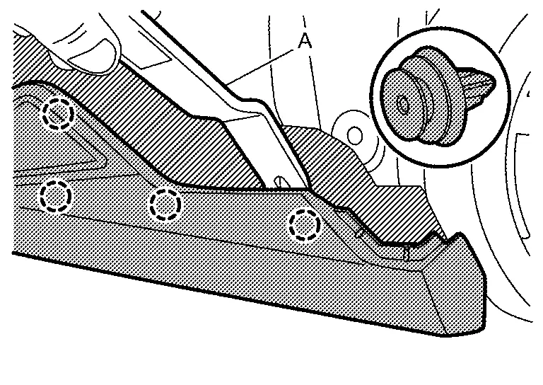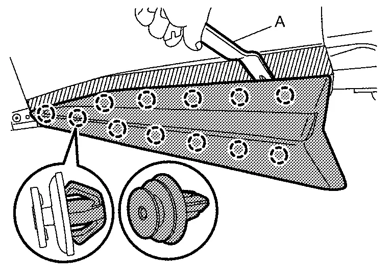 Disengage front side guard molding fixing clips using a remover tool (A), and then remove front side guard molding.