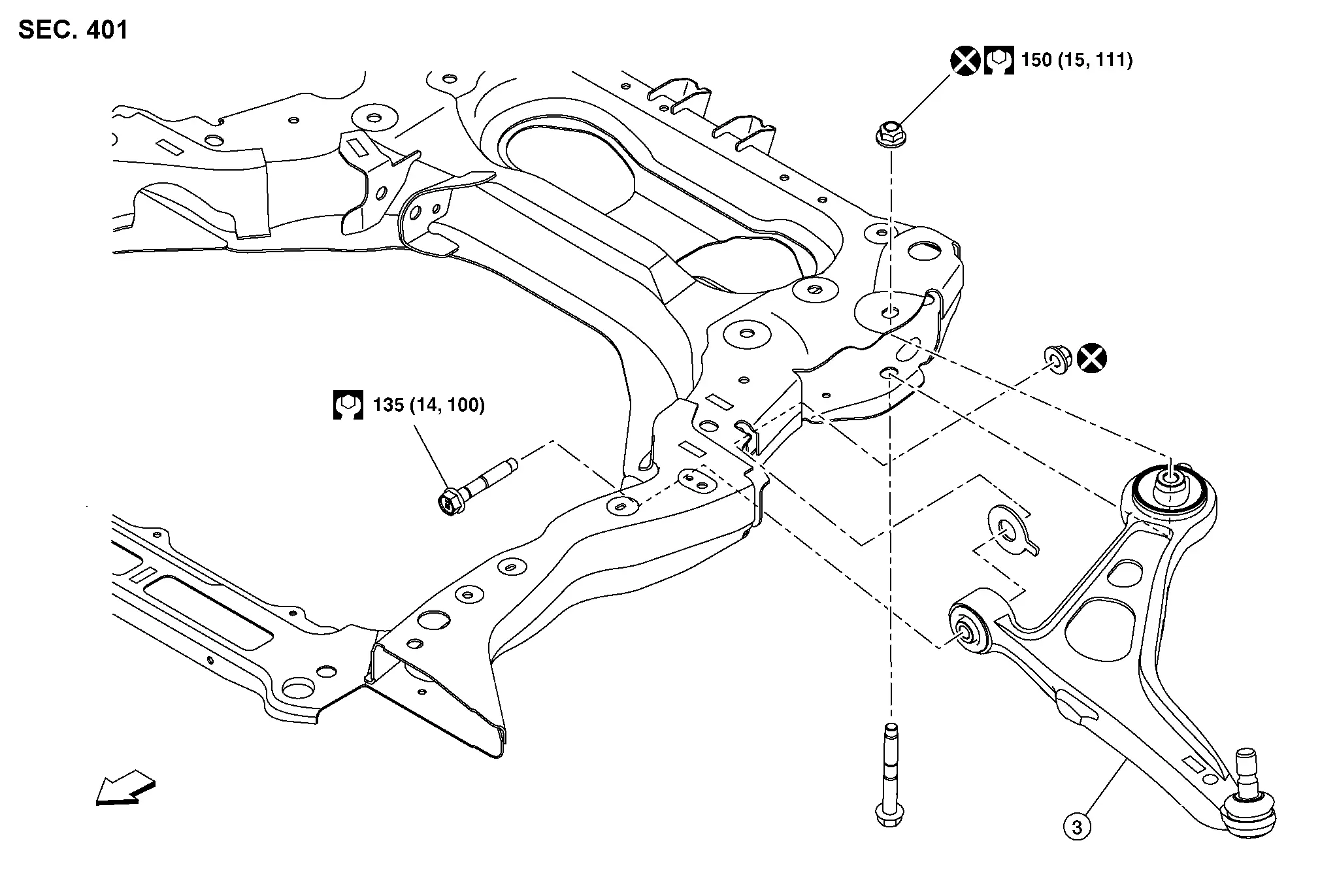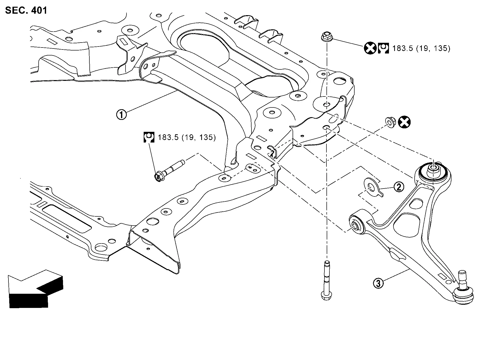 | 1. | Front suspension member | 2. | Bush | 3. | Transverse link |