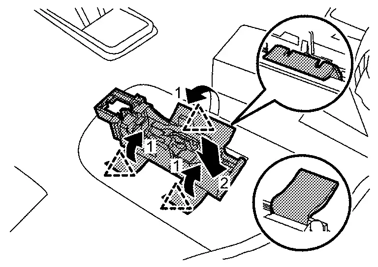 Disengage vanity mirror lamp assembly fixing pawls according to numerical order 1→2 indicated by arrows as shown in the figure, and then remove vanity mirror lamp assembly.