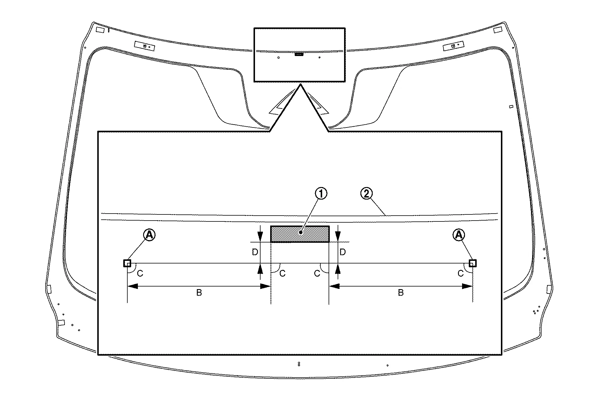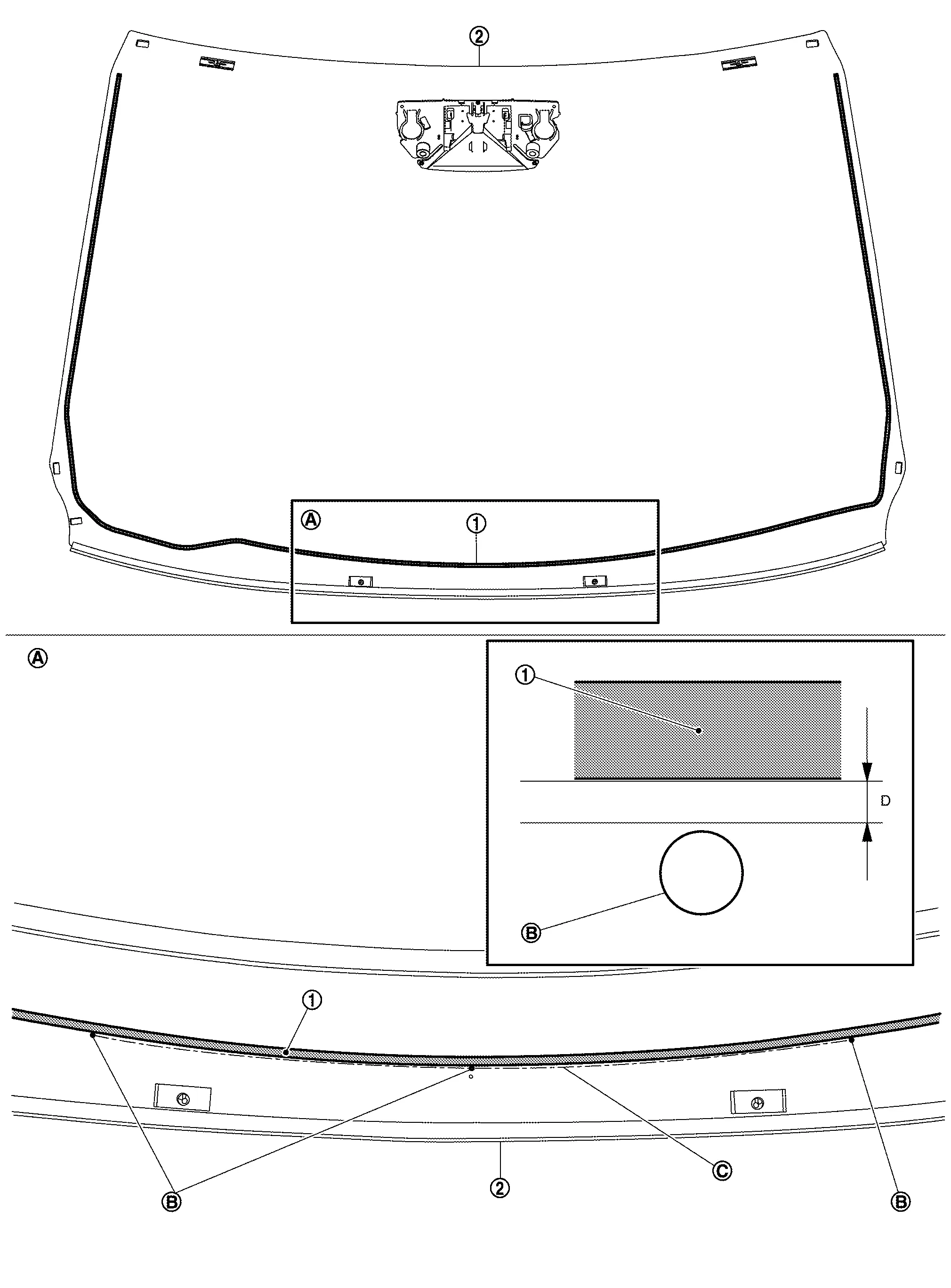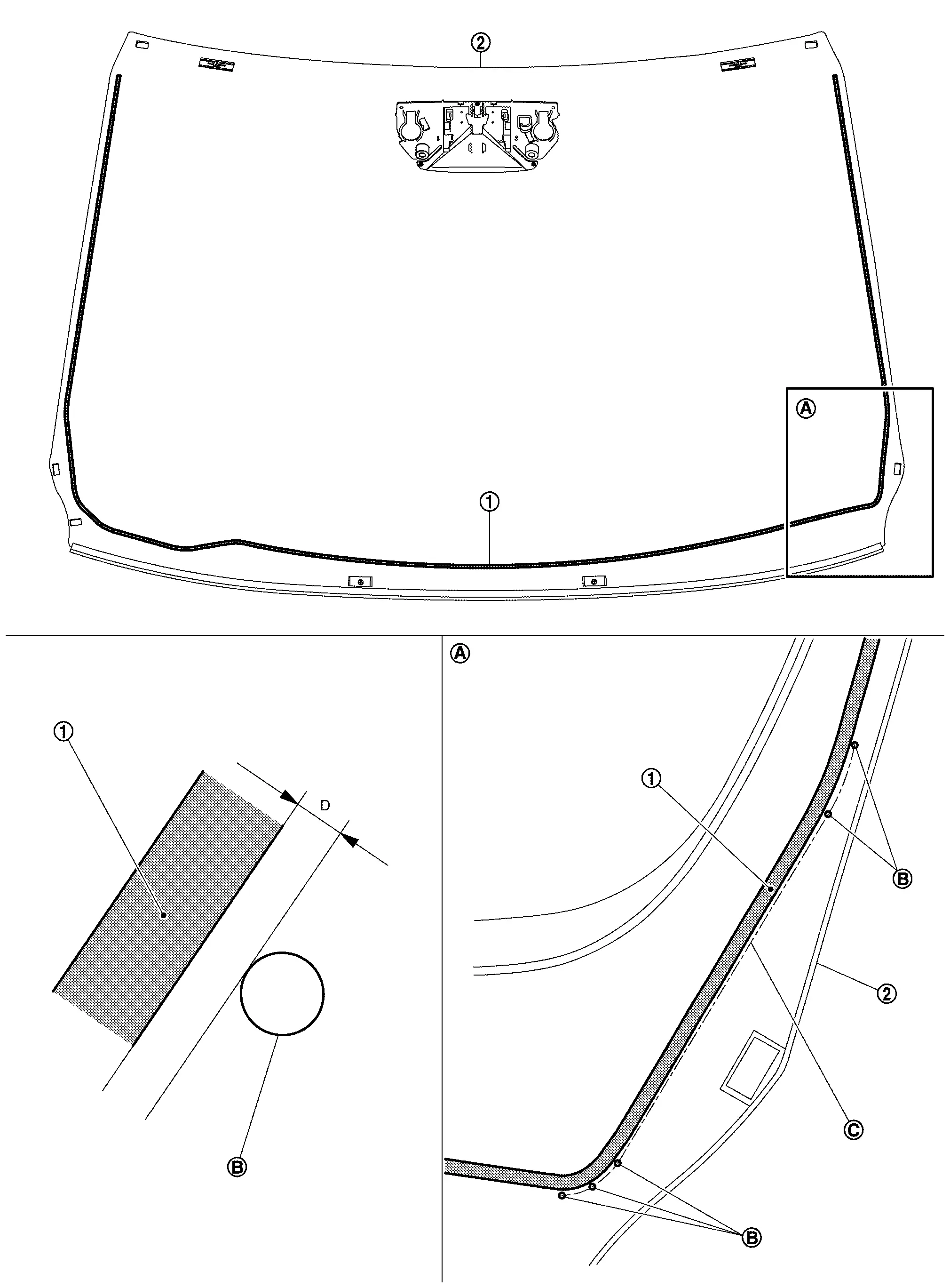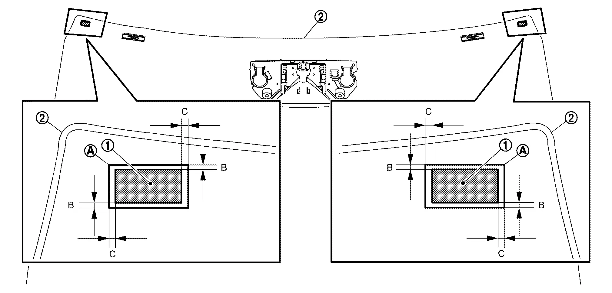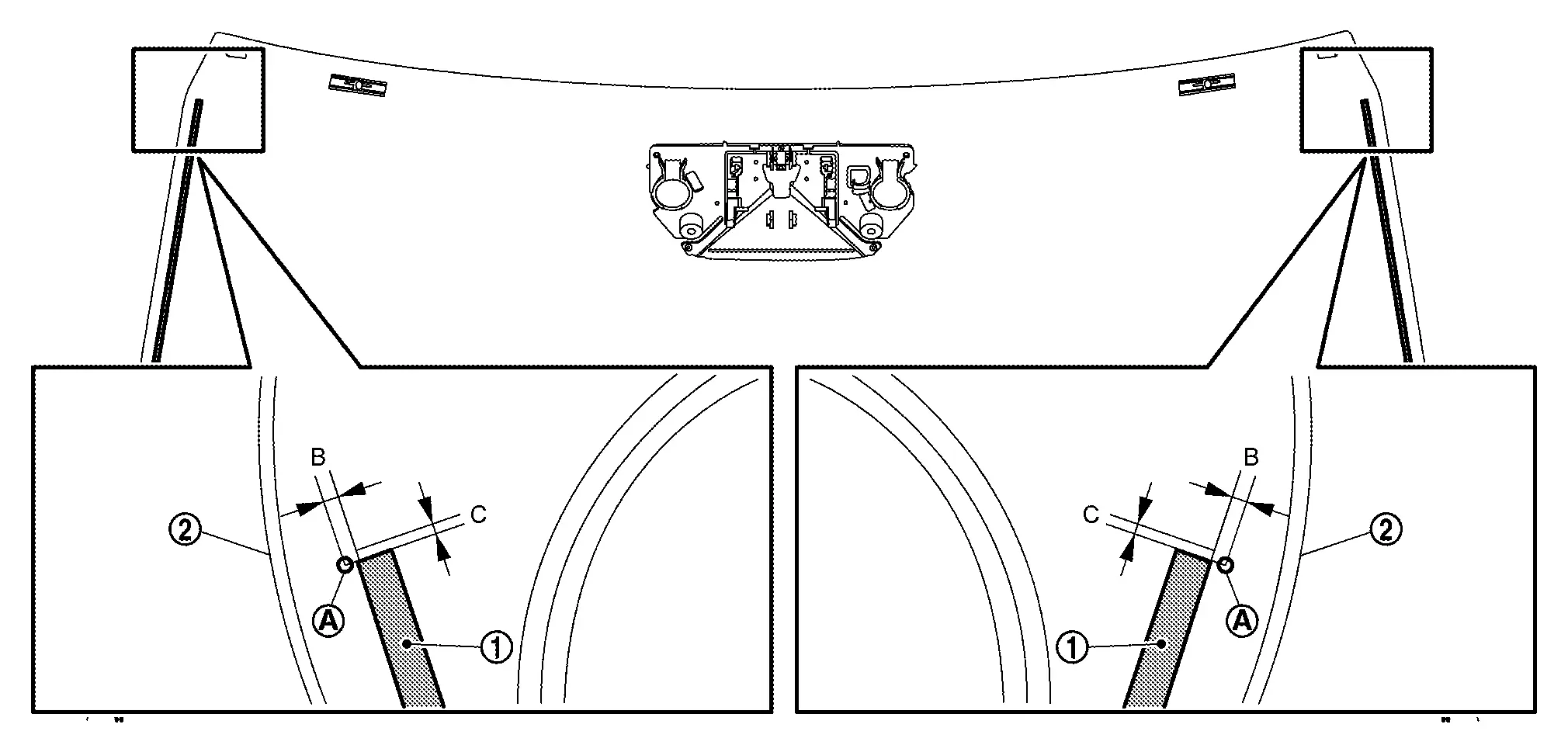 : Windshield glass black print matching mark B : 1.5 mm (0.059 in) C : 2.0 mm (0.079 in) -