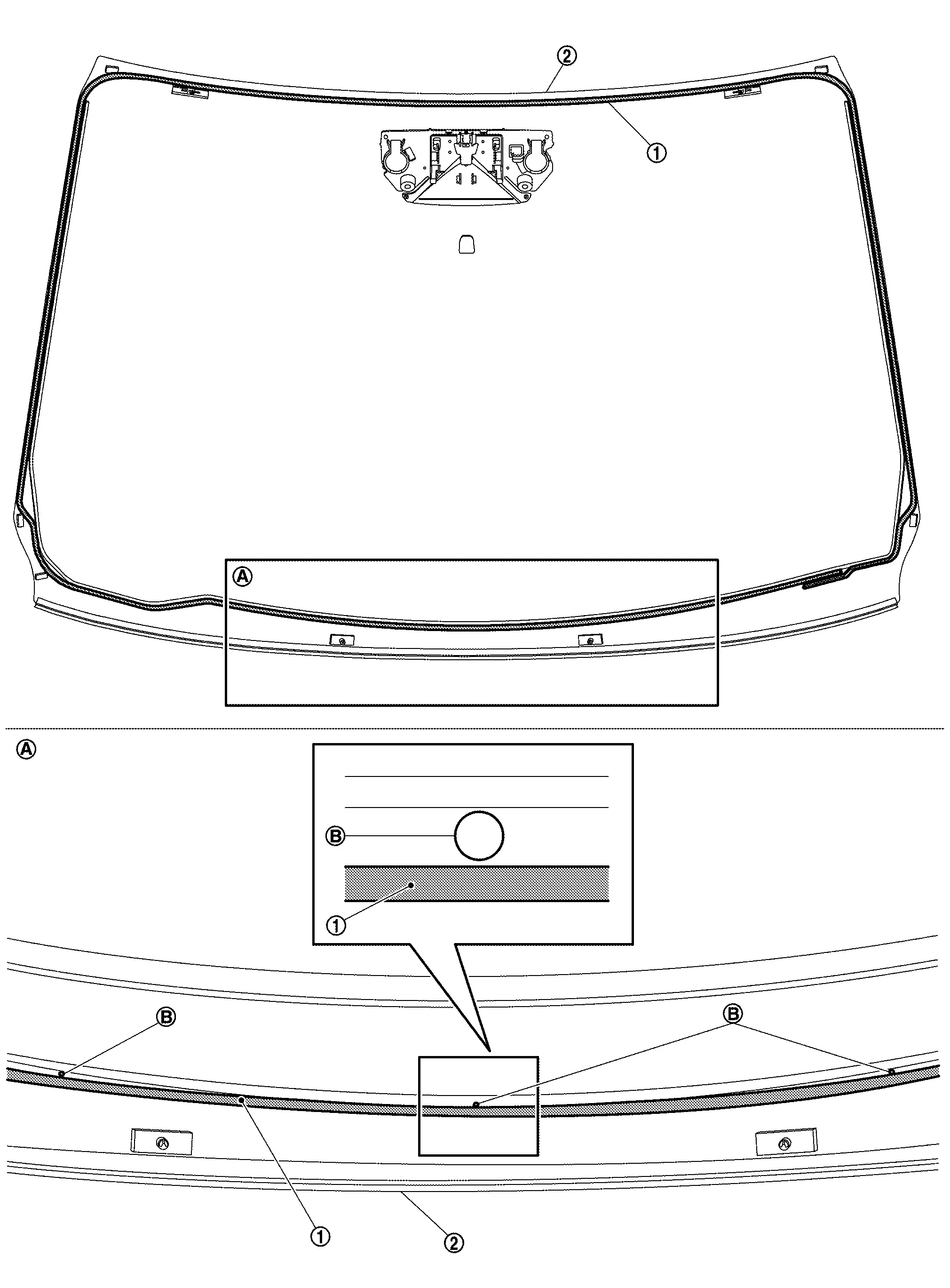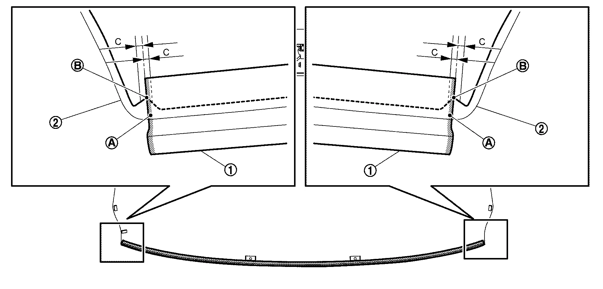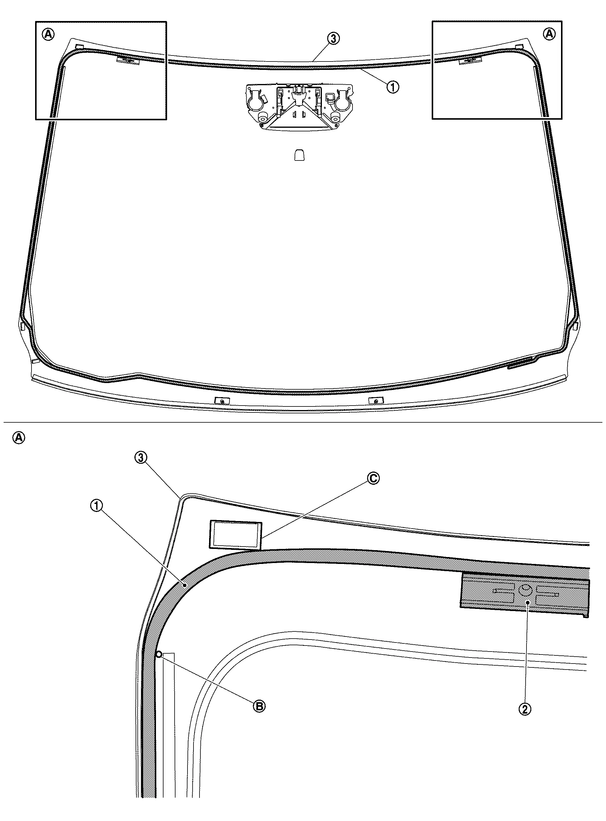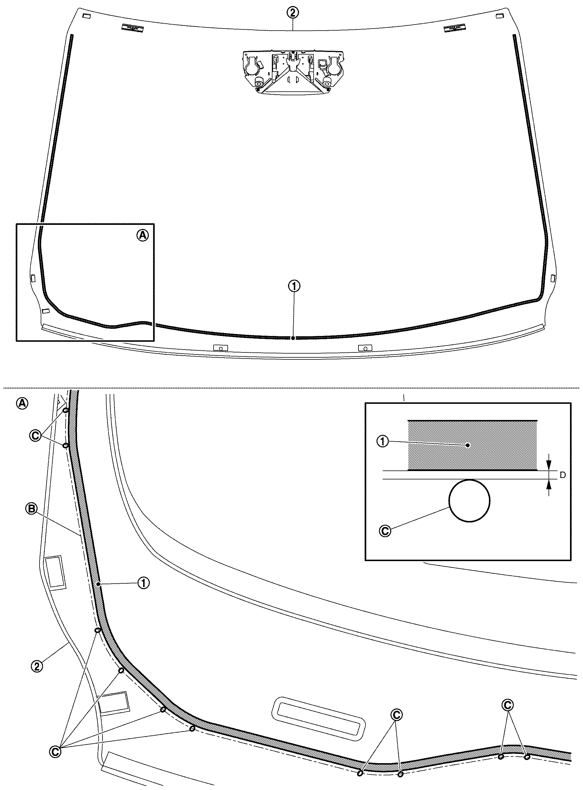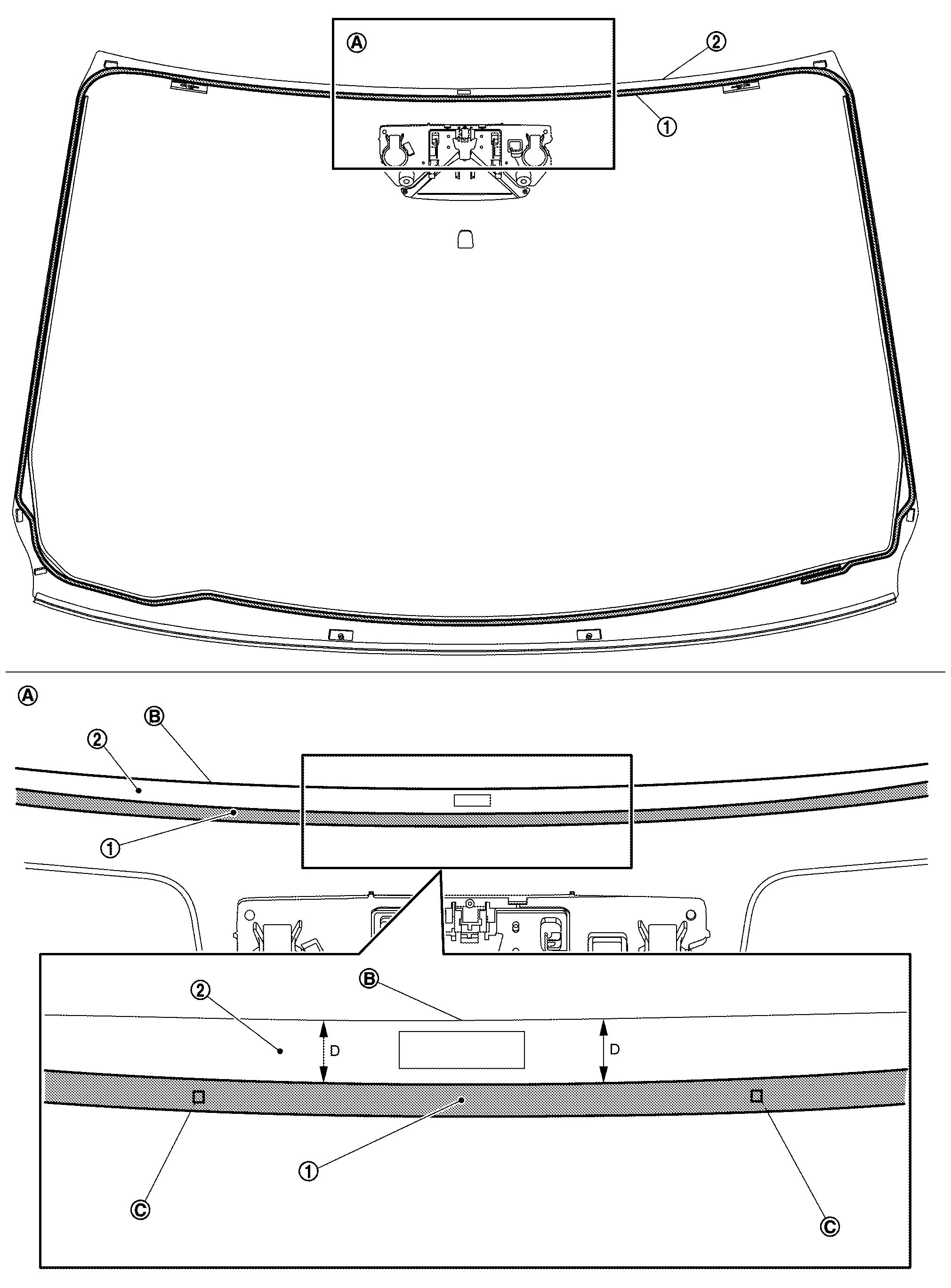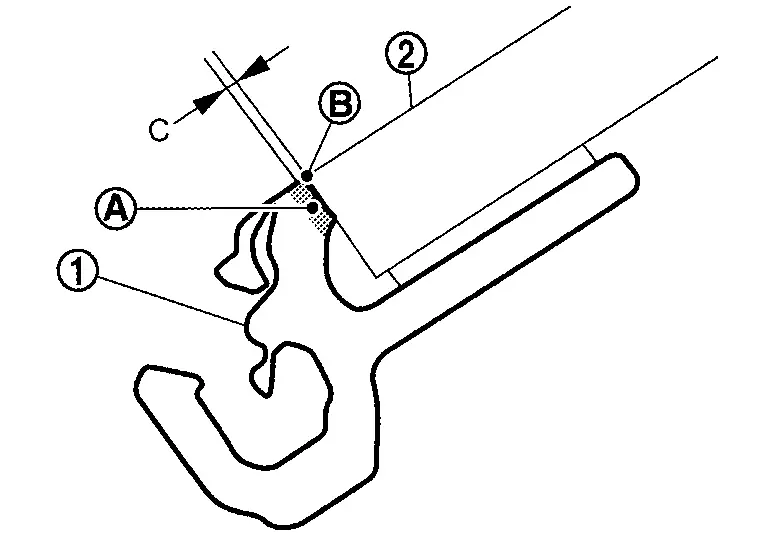 : Windshield glass black print matching mark B : 1.5 mm (0.059 in) C : 2.0 mm (0.079 in) -