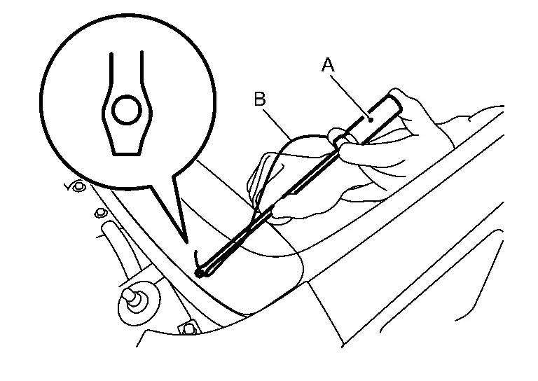 Cut the adhesive using a piano wire.Pass the piano wire (B) from passenger room to bonded area of glass using a wire pierce (A).