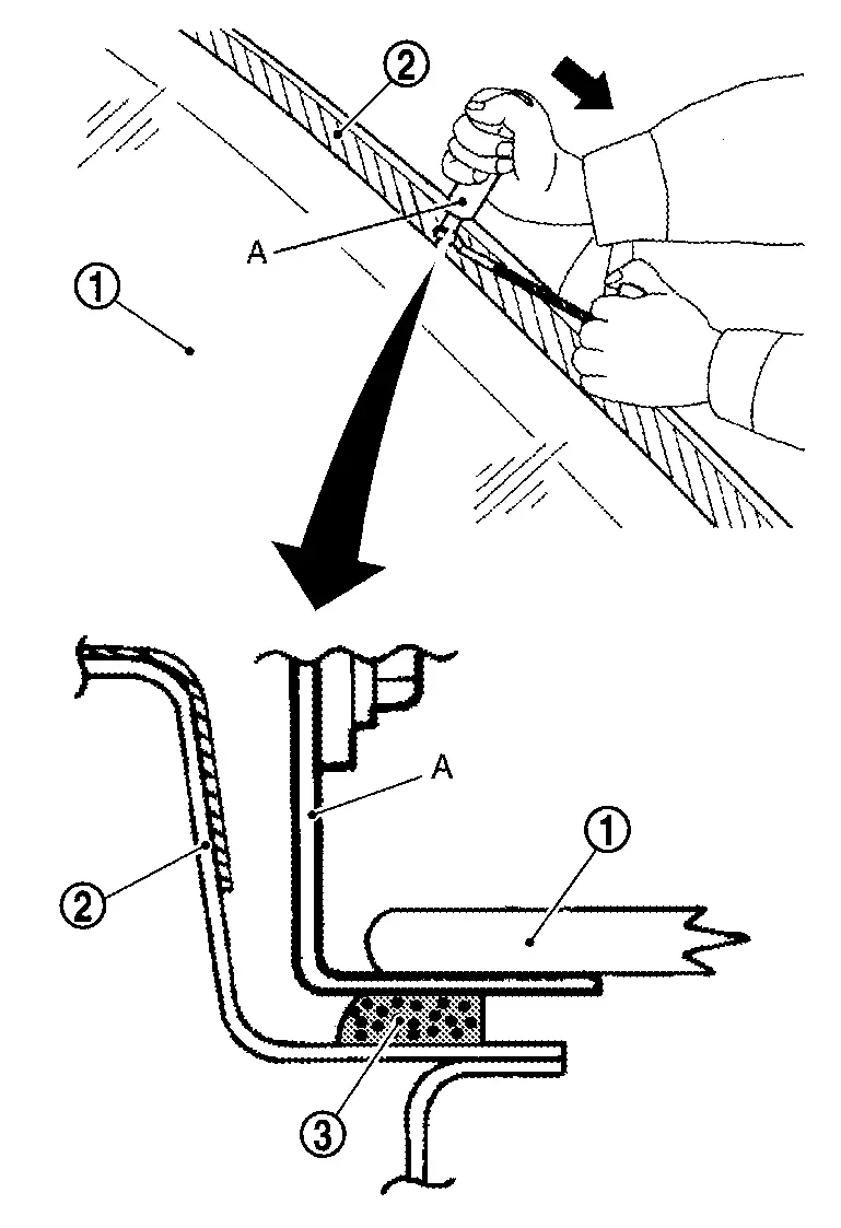 Use a cutter knife or scraper, and leave the of adhesive and sealant on the body side approximately 2 mm (0.079 in) (A) to make adhesive and sealant surface smooth.