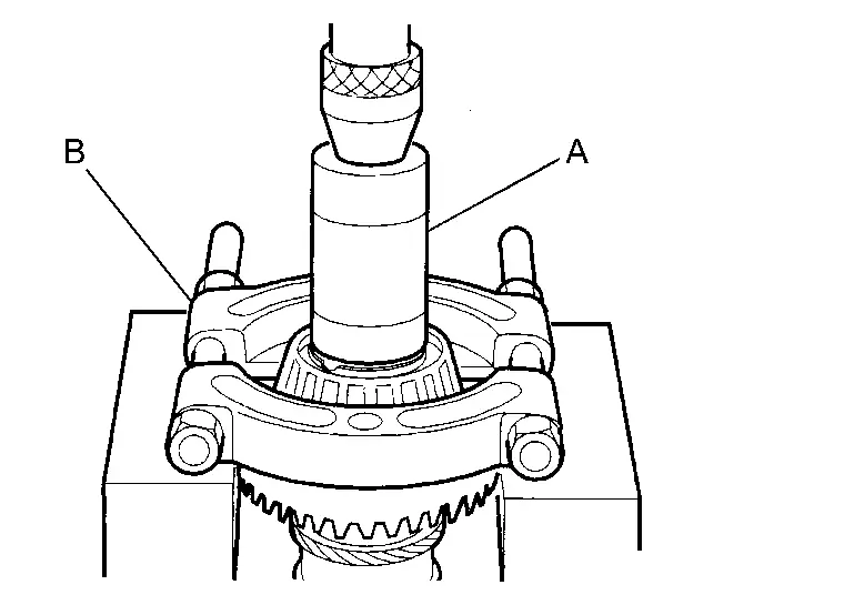 Remove ring gear bearing inner race (transfer cover side) from ring gear shaft using drift (A) (commercial service tool) and separator (B) (commercial service tool).