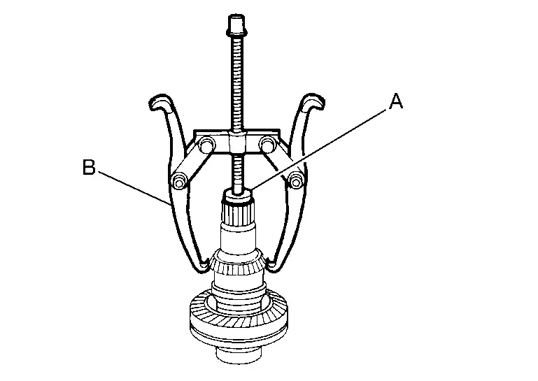 Remove ring gear bearing inner race (transfer case side) from ring gear shaft with drift (A) [SST: ST33061000 (NI-8107-2)] and puller (B) (commercial service tool).