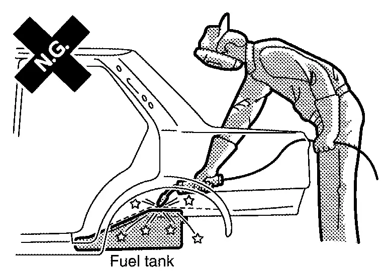 When welding parts near the fuel tank fuel filler, be sure to remove the fuel tank. Plug the filler port of the tank.