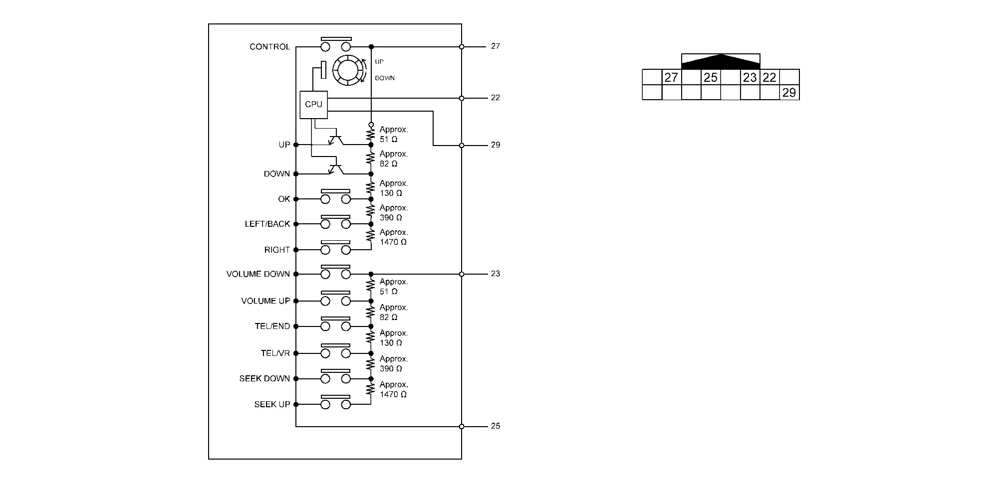 (Approx.) ΩTerminal 23 25 SEEK UP switch is pressed 2080.54 – 2165.46 SEEK DOWN switch is pressed 639.94 – 666.06 TEL/VR switch is pressed 257.74 – 268.26 TEL END switch is pressed 130.34 – 135.66 VOL UP switch is pressed 49.98 – 52.02 VOL DOWN switch is pressed 1 or less